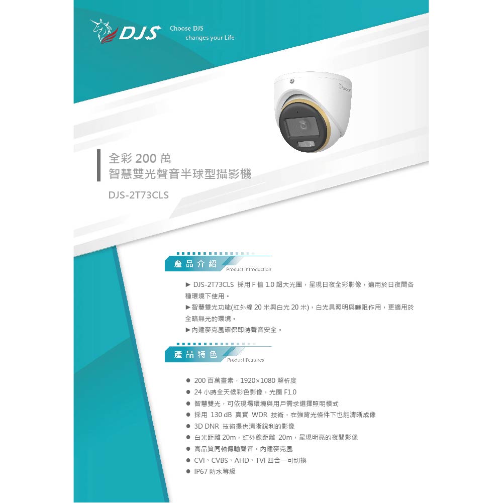 昌運監視器 DJS-2T73CLS 全彩200萬智慧雙光聲音半球型攝影機 智慧雙光功能 內建麥克風