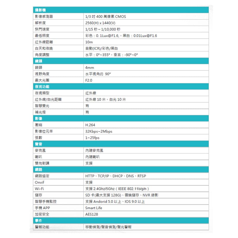 400萬畫素,紅外線10米、白光10米