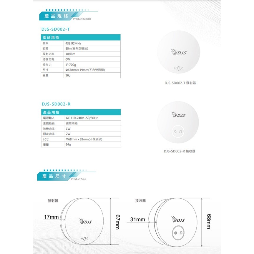 【贈送 智慧捲門開關專用安裝盒(DJS-BOX01)】-DJS-SD001Pro通過台灣NCC認證,已投保3200萬產品責任險,請安心選購。-原有開關直接更換,輕鬆升級(5G智慧捲門開關需要另外接AC110V或220V電源)。-出門免帶遙控器,手機開關超方便。-基本功能:5G/2.4G雙頻連線、面板防誤觸鎖定、Siri/Google語音控制、藍牙開關門、開關門推播通知、面板背光控制、支援多WiFi AP備援連線、定時/排程開關門、APP設定捲門模式(快速門或傳統捲門)、開關門時間控制(1秒~900秒)、多人手機控制(免付費)。-附加功能(須搭配DJS-DR03捲門感應器):門位顯示、設定防區、開關門紀錄。-防壓功能(須搭配DJS-IR02紅外線偵測器)。-無線協議:Wi-Fi 2.4GHz&5GHz 雙頻連線。-輸入電壓:AC100~240V(50/60Hz)。-手機APP控制捲門上、停、下。-APP:Smart Life。-尺寸:單聯,120mm×76mm×34m。注意:本產品需要另外接電源(AC110V或220V)。DJS-SD002-發射器採用自發電按壓發電技術發射無線訊號-接收器採用電源插座直插,即插即用-接收發射器發出的無線訊號響鈴-手機推播通知,音量可調-燈光+聲音/聲音/燈光三種模式切換-勿擾時段設定,一個發射器可對應多個接收器DJS-B60