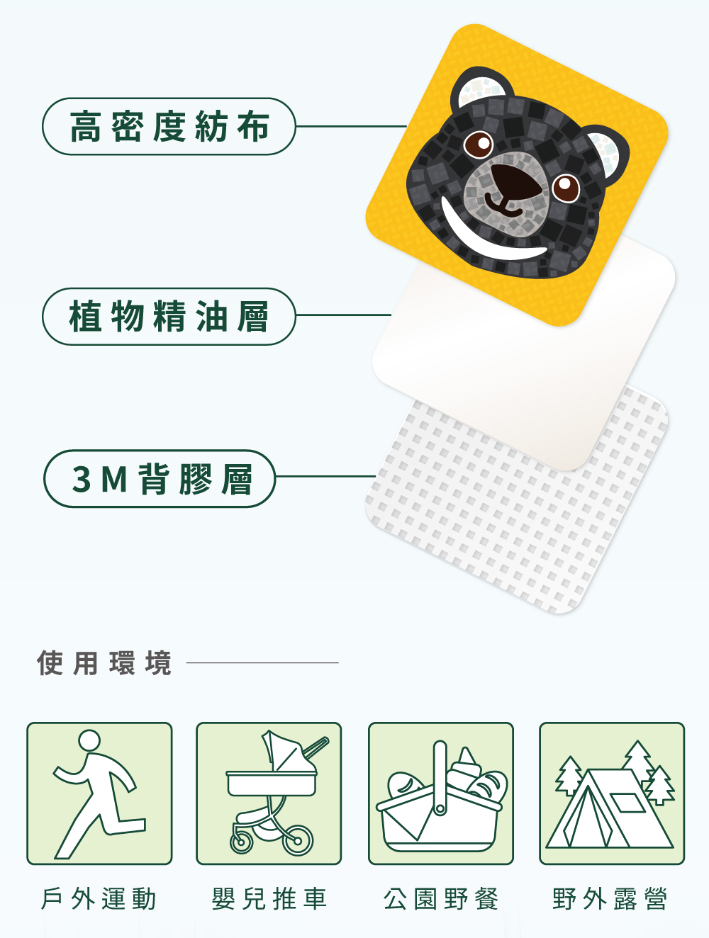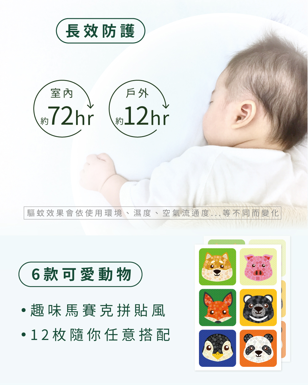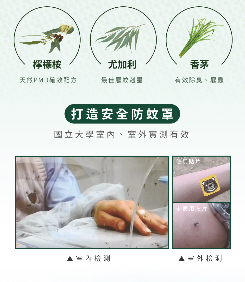 商品特色:1. US EPA 公告有效植物性萃取2. 經SGS 多項檢驗合格3. 高密度無紡布無毒材質製成4. 採用3M背膠,產品黏於衣服、帽子或鞋子上5. 室內有效約12-72小時,戶外約8-12小時商品規格:1. 成分:香茅精油、尤加利、(PMD檸檬胺植物性配方)2. 數量:12入/盒