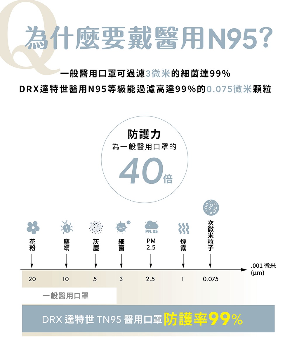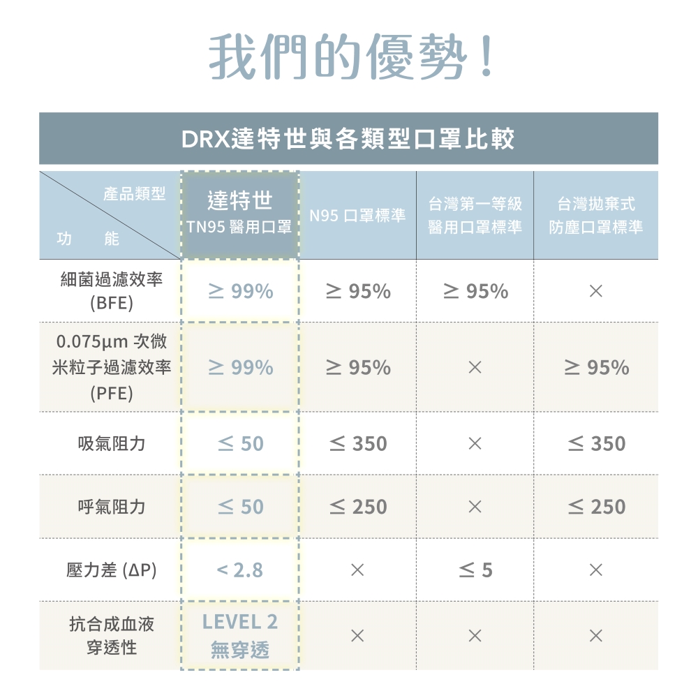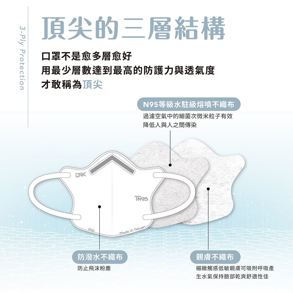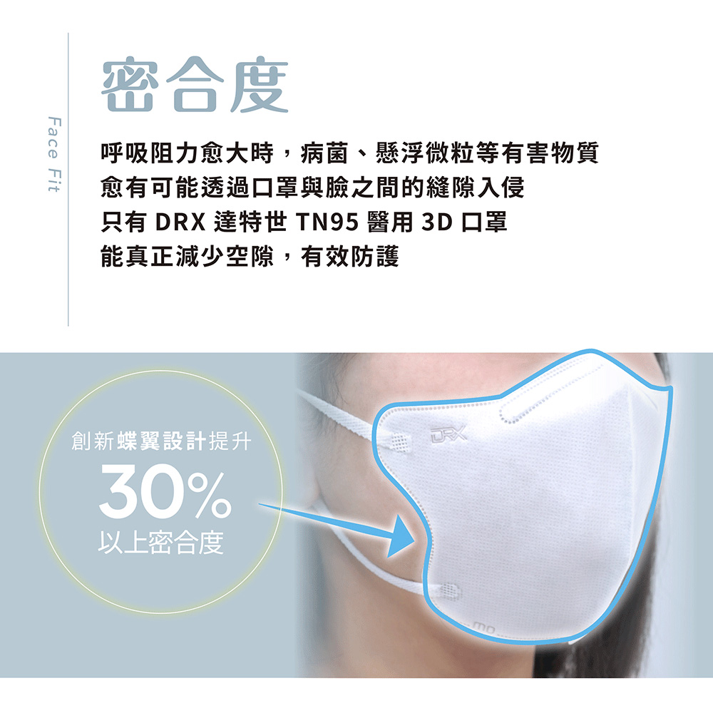 「消費者使用前應詳閱醫療器材說明書」●醫療器材品名:"達特世" TN95 醫用防護口罩 (未滅菌)●醫療器材許可證字號:衛部醫器製壹字第009814號●許可證所有人:達特世生技有限公司●許可證所有人地址:新北市三重區溪尾街14號5樓●製造業者名稱:達特世生技有限公司●製造業者地址:新北市三重區溪尾街14號5樓之1及5樓之2●醫療器材商名稱:達特世生技有限公司●醫療器材商地址:新北市三重區溪尾街14號5樓●醫療器材商許可證字號:新北府重衛醫器販字第 MD6231017084 號●醫療器材商諮詢專線:02-22868689品牌:DRX 達特世規格:20入/1組貨源:自產自銷產地:台灣材質:不織布保存期限:4年「此商品屬個人衛生用品,不適用七天鑑賞期法規,拆封無猶豫期,如欲退貨請勿拆封。」