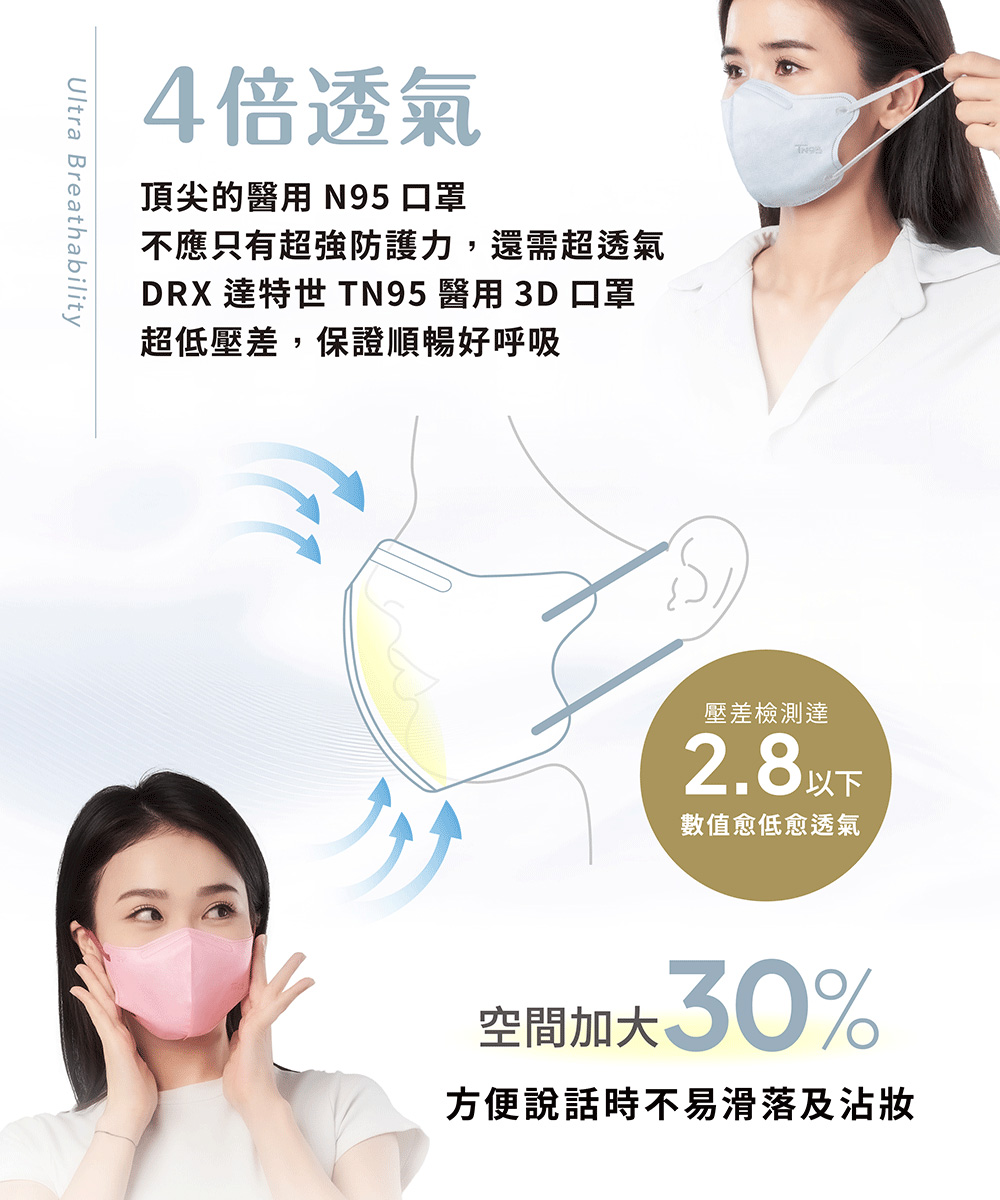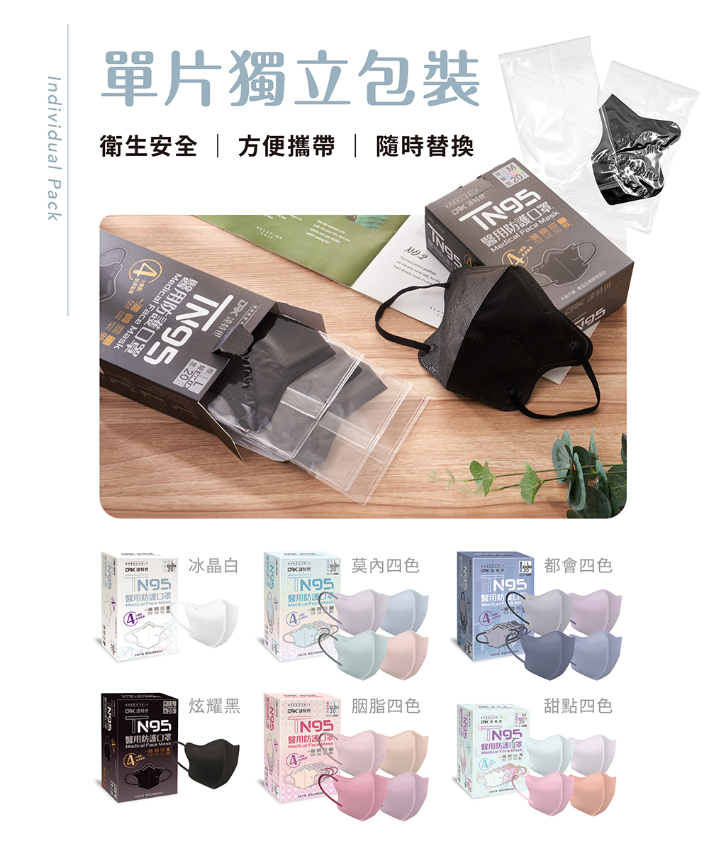 【小提醒】※假日不出貨,顏色及數量已當下實際庫存量為主,庫存量不足將另行通知※※口罩屬個人衛生用品故經拆封後符合消保法第十九條所訂定之合理例外情事,無七日猶豫期,如欲退貨請勿拆封※※每批布的顏色,略有色差,依實際出貨商品為主※注意: 由於超商有寄貨限制,一筆訂單最多18盒 (如果超過18盒, 請分兩筆訂單下單)注意: 由於超商有寄貨限制,一筆訂單最多18盒 (如果超過18盒, 請分兩筆訂單下單)注意: 由於超商有寄貨限制,一筆訂單最多18盒 (如果超過18盒, 請分兩筆訂單下單)#不脫妝 #單片包裝 #防脫妝 #獨立包裝 #透氣 #N95 【商品特色】✨全新改版 3D立體美型剪裁✨全新升級 日本高規鼻樑壓條+無壓力耳繩設計✨防護透氣4倍升級舒適度再進化✨單片獨立包裝,方便攜帶✨通過台灣TN95認證(CNS14774/CNS 14755)✨台灣生產製造,品質保證【商品資訊】●醫療器材品名:"達特世" TN95 醫用防護口罩 (未滅菌)●醫療器材許可證字號:衛部醫器製壹字第009814號●規格:20片/盒●顏色:冰晶白/炫耀黑/莫內四色/胭脂四色/都會四色●尺寸:S幼幼:9.5cm x 8.5cm【建議1-4歲】M兒童:11.5cm x 9cm【建議4歲以上】L成人:13.5cm x 10.5cmXL成人加大:15cm x 11cm●主要成分或材料:防潑水性不織布、N95等級水駐極熔噴不織布、親膚性不織布●保存期限:4年●製造日期:2025.01.26●商品原產地:台灣【醫療器材許可證】核定中文品名: “達特世” TN95 醫用防護口罩 (未滅菌)核准字號:衛部醫器製壹字第009814號製造業者名稱:達特世生技有限公司製造業者地址:新北市三重區溪尾街14號5樓之1及5樓之2【販賣業醫療器材商許可執照】許可執照字號: 新北府重衛醫器販字第 MD6231017084 號醫療器材商名稱:達特世生技有限公司地址:新北市三重區溪尾街14號5樓諮詢專線電話:02-22868689