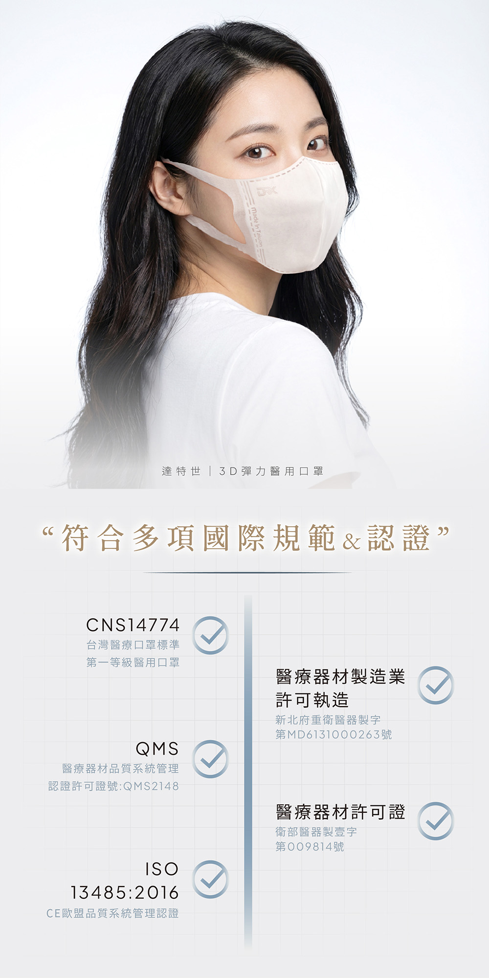 「消費者使用前應詳閱醫療器材說明書」●醫療器材品名: "達特世" 醫用口罩 (未滅菌)●醫療器材許可證字號:衛部醫器製壹字第008685號●許可證所有人:達特世生技有限公司●許可證所有人地址:新北市三重區溪尾街14號5樓●製造業者名稱:達特世生技有限公司●製造業者地址:新北市三重區溪尾街14號5樓之1及5樓之2●醫療器材商名稱:達特世生技有限公司●醫療器材商地址:新北市三重區溪尾街14號5樓●醫療器材商許可證字號:新北府重衛醫器販字第 MD6231017084 號●醫療器材商諮詢專線:02-22868689品牌:DRX 達特世規格:50入/1組貨源:自產自銷產地:台灣材質:不織布保存期限:5年「此商品屬個人衛生用品,不適用七天鑑賞期法規,拆封無猶豫期,如欲退貨請勿拆封。」【小提醒】服務時間:周一至週五 09:00 ~ 18:00 (例假日、國定假日除外)假日不出貨,顏色及數量已當下實際庫存量為主,庫存量不足將另行通知!※口罩屬個人衛生用品故經拆封後符合消保法第十九條所訂定之合理例外情事,無七日猶豫期,如欲退貨請勿拆封※※每批布的顏色,略有色差,依實際出貨商品為主※※外盒為新/舊款隨機出貨,口罩材質皆一致※注意: 由於超商有寄貨限制,一筆訂單最多18盒 (如果超過18盒, 請分兩筆訂單下單)注意: 由於超商有寄貨限制,一筆訂單最多18盒 (如果超過18盒, 請分兩筆訂單下單)注意: 由於超商有寄貨限制,一筆訂單最多18盒 (如果超過18盒, 請分兩筆訂單下單)【商品資訊】●醫療器材品名: "達特世" 醫用口罩 (未滅菌)●醫療器材許可證字號:衛部醫器製壹字第008685號●規格:50片/盒●尺寸:成人(L):口罩總寬17.3cm、口罩總寬(不含耳繩)8.7cm、長度12.8cm(±0.5cm)●主要成分或材料:防潑水性不織布、熔噴不織布、親膚性不織布●保存期限:5年●製造日期:2025.01.12●商品原產地:台灣●貨源:公司貨【醫療器材許可證】核定中文品名: "達特世" 醫用口罩 (未滅菌)核准字號:衛部醫器製壹字第008685號製造業者名稱:達特世生技有限公司製造業者地址:新北市三重區溪尾街14號5樓之1及5樓之2【販賣業醫療器材商許可執照】許可執照字號: 新北府重衛醫器販字第 MD6231017084 號醫療器材商名稱:達特世生技有限公司地址:新北市三重區溪尾街14號5樓諮詢專線電話:02-22868689