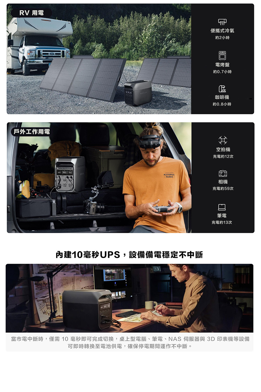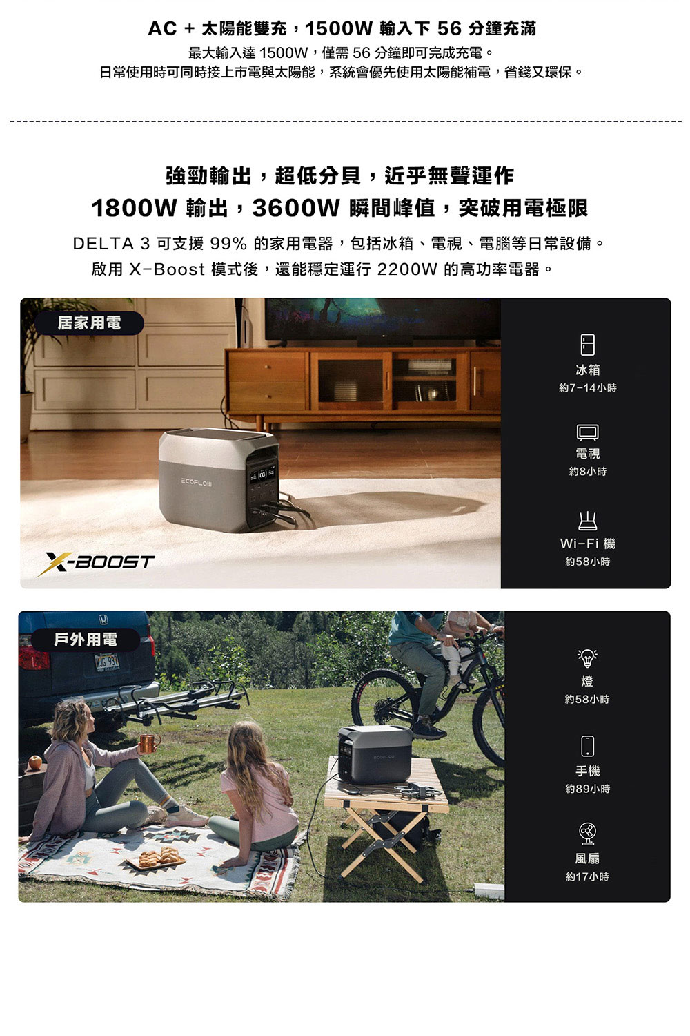 • 搭配 DELTA 3 擴充電池、DELTA Pro 3 擴充電池、DELTA 2 擴充電池或 DELTA 2 Max 擴充電池,儲電容量可擴充至 1~5kWh• 提供 1800W AC 輸出功率,啟用 X-Boost 模式可達 2200W(瞬間最大 3600W)• 支援 5 種快速充電方式:市電、太陽能、800W 車用發電機、3000W 智慧發電機(雙燃料)、多元混合充電• 原廠提供 5 年保固• NCC認證字號:CCAH25Y10140T2• BSMI認證字號:R3H106(型式EF-DL-H10-3)