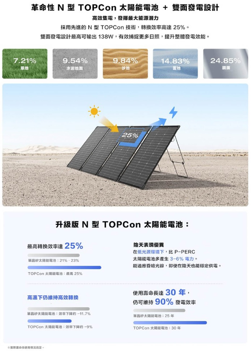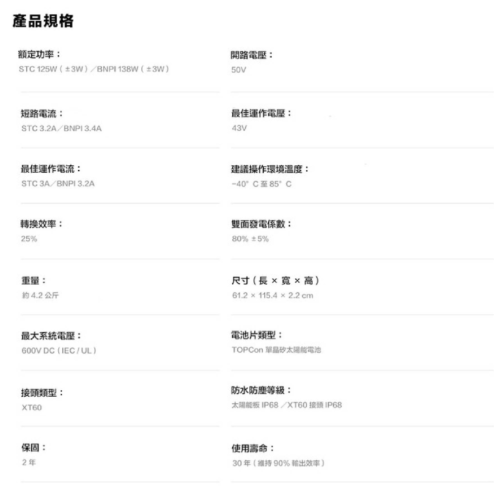 • 模組化設計:最多可並聯 8 片太陽能板(總功率達 1000W)• 可調式角度設計:角度可在 30–60° 之間調整,以獲得最佳日照效率• 最高 25% 轉換效率• 標準測試條件(STC)功率 125W,最佳北方光照(BNPI)達 138W• 採用 TOPCon 太陽能電池,即使在弱光或高溫環境下也能穩定發電• IP68 防水等級,堅固耐用,應對各種天候• 多元應用場景:適用於居家、後院或露營車(RV)使用• 輕量設計:4 片太陽能板總重僅 16.2 公斤(35.2 磅)• 產品壽命最高達 30 年