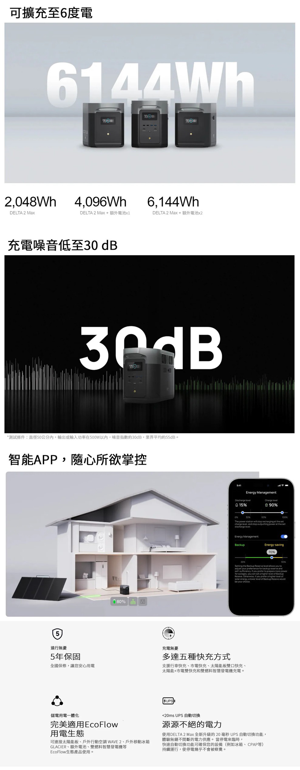 • 電池容量 2048Wh,搭配 DELTA 2 Max 額外電池以達到 6144Wh• 透過X-Boost模式,可提供高達 3400W的輸出功率,可運行99%的家用電器• 一次供電15個設備,包括6個AC插座• 獨家 X-Stream 雙交流+太陽能充電速度,最高可達1000AW的太陽能輸入,充電速度最快為2.3小時• 99%的MPPT效率最大化了任何時候的太陽能發電• 配備同樣用於電動汽車的磷酸鐵鋰電池,延長使用年限,循環使用次數約可達3000次• 保固五年• BSMI認證字號:R3E975(型式EFD350)• NCC字號:CCAF22Y10160T0