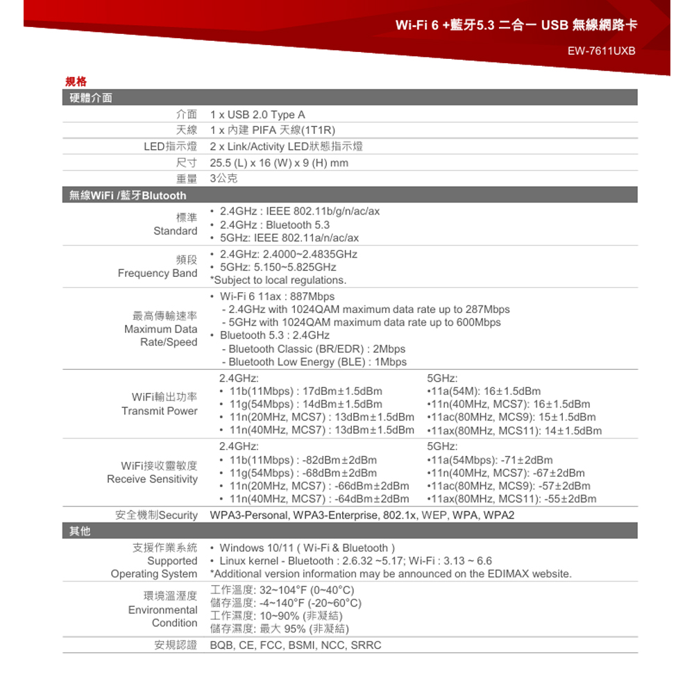 昌運監視器 EDIMAX 訊舟 EW-7611UXB Wi-Fi 6+藍牙 5.3 二合一 USB 無線網路卡