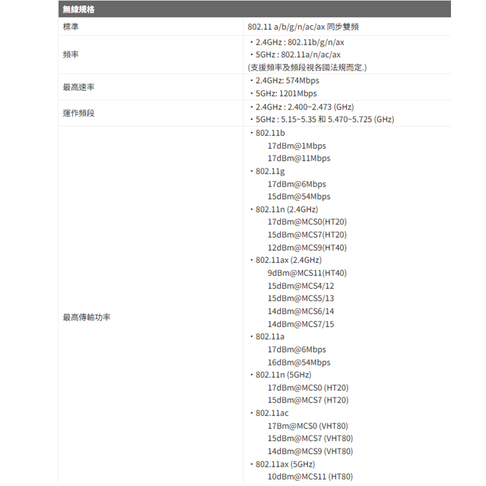 -AX1800 Wi-Fi 6 : 無線傳輸速率最高可達1800Mbps (2.4GHz時速率為574Mbps,5GHz時速率為1201Mbps)。