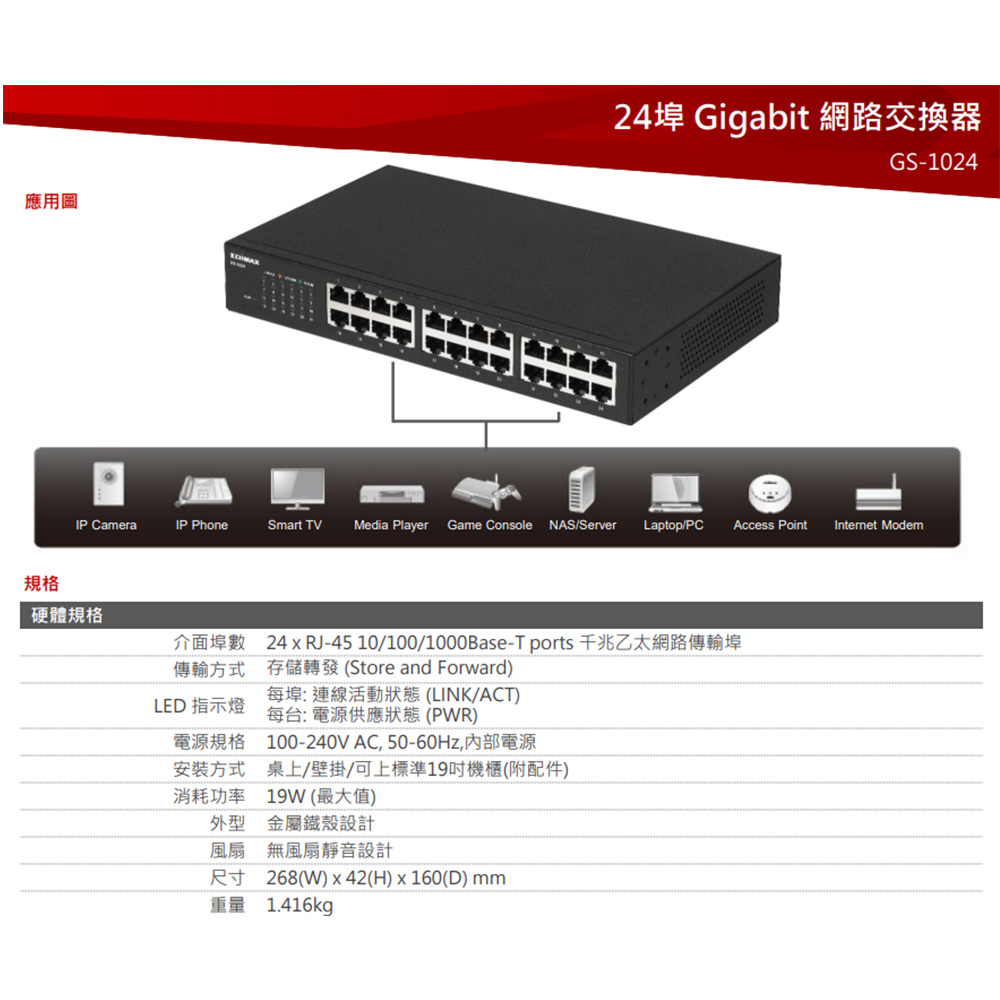 -即插即用 : 只需將支援乙太網路設備接上交換器即可使用,無需額外佈線及配置。