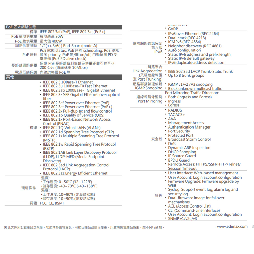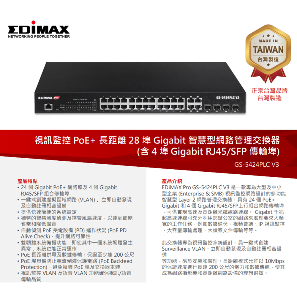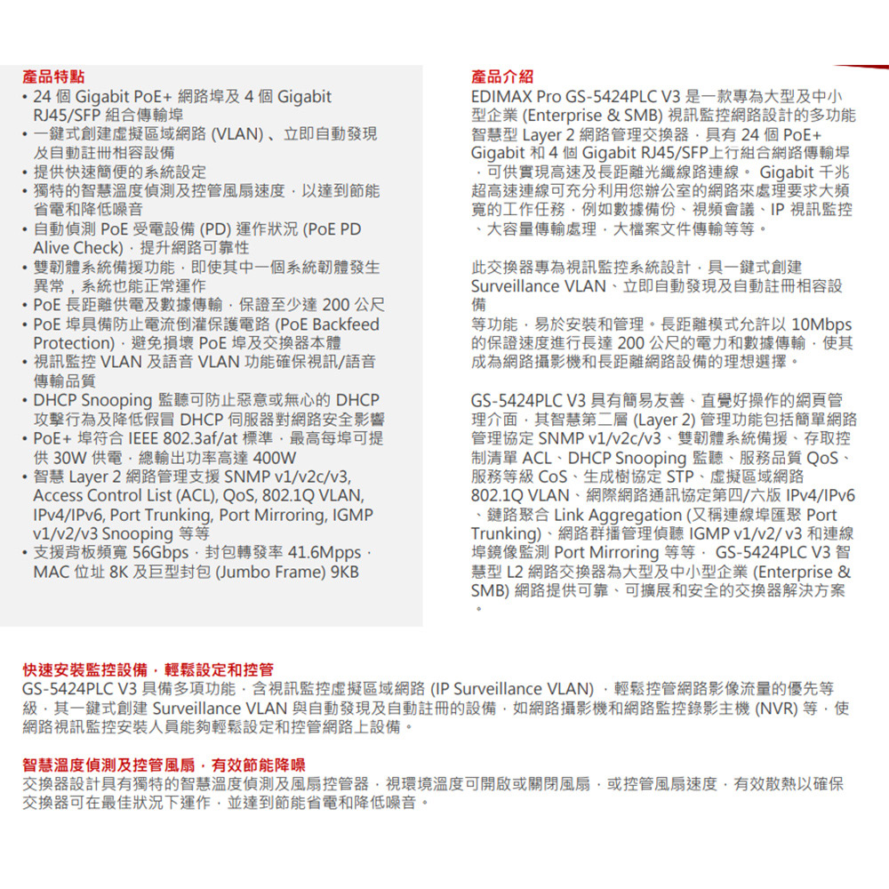 -智慧Layer 2網路管理支援SNMP v1/v2c/v3, Access Control List (ACL), QoS,802.1Q VLAN, IPv4/IPv6, Port Trunking, Port Mirroring, IGMP v1/v2/v3 Snooping等等。
