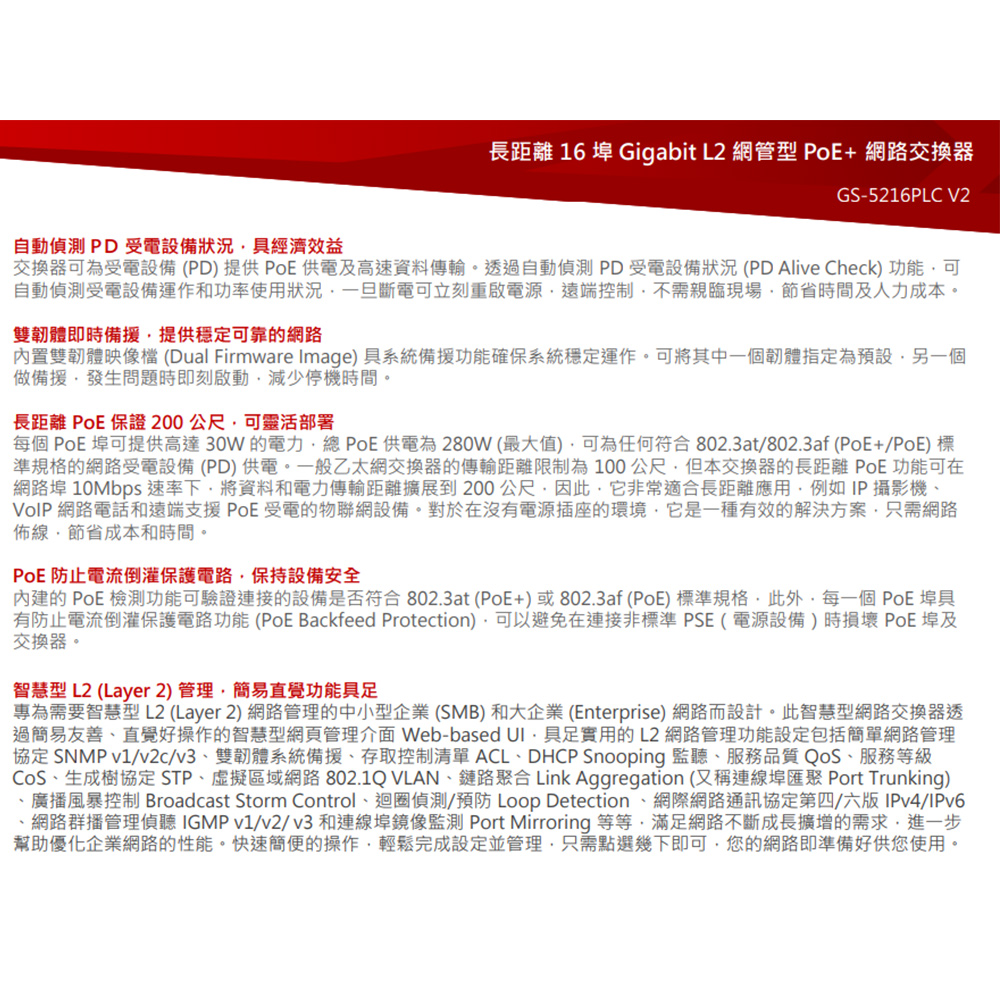 -智慧Layer 2網路管理支援SNMP v1/v2c/v3, Access Control List (ACL), QoS,802.1Q VLAN, IPv4/IPv6, Port Trunking, Port Mirroring, IGMP v1/v2/v3 Snooping等等。