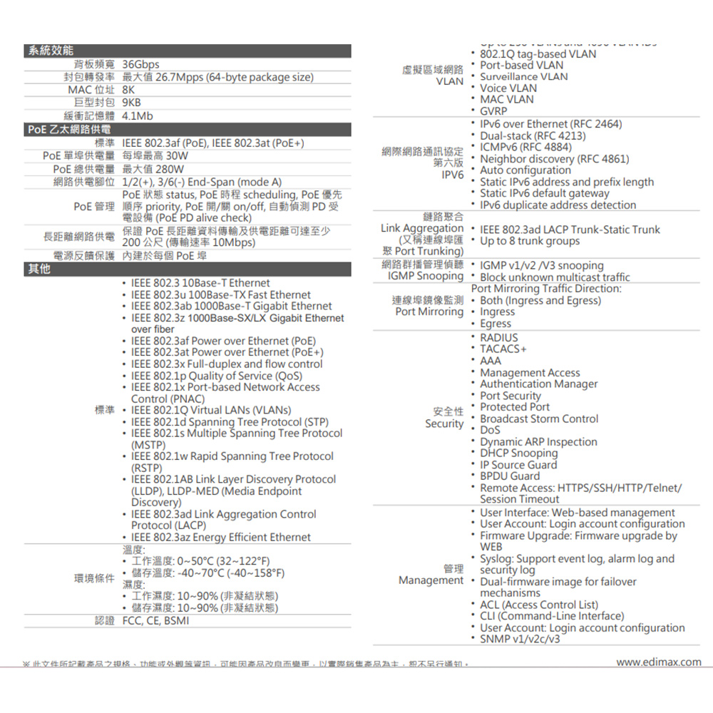 -支援背板頻寬36Gbps,封包轉發率26.7Mpps,MAC位址8K及巨型封包(Jumbo Frame) 9KB。