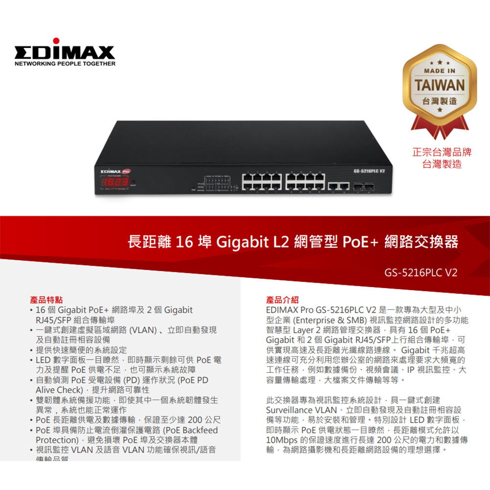 -16個Gigabit PoE+網路埠、2個Gigabit RJ45/SFP組合傳輸埠。