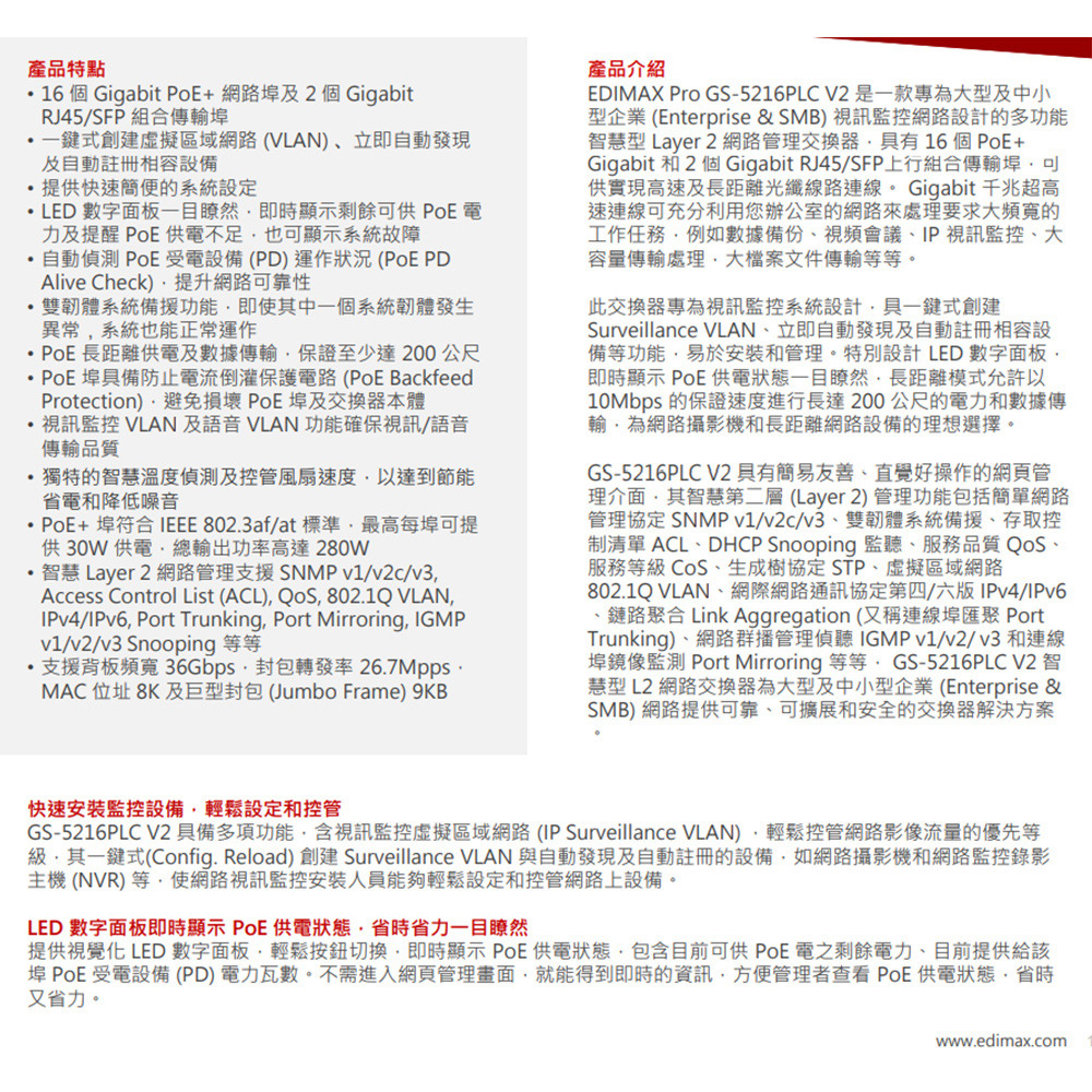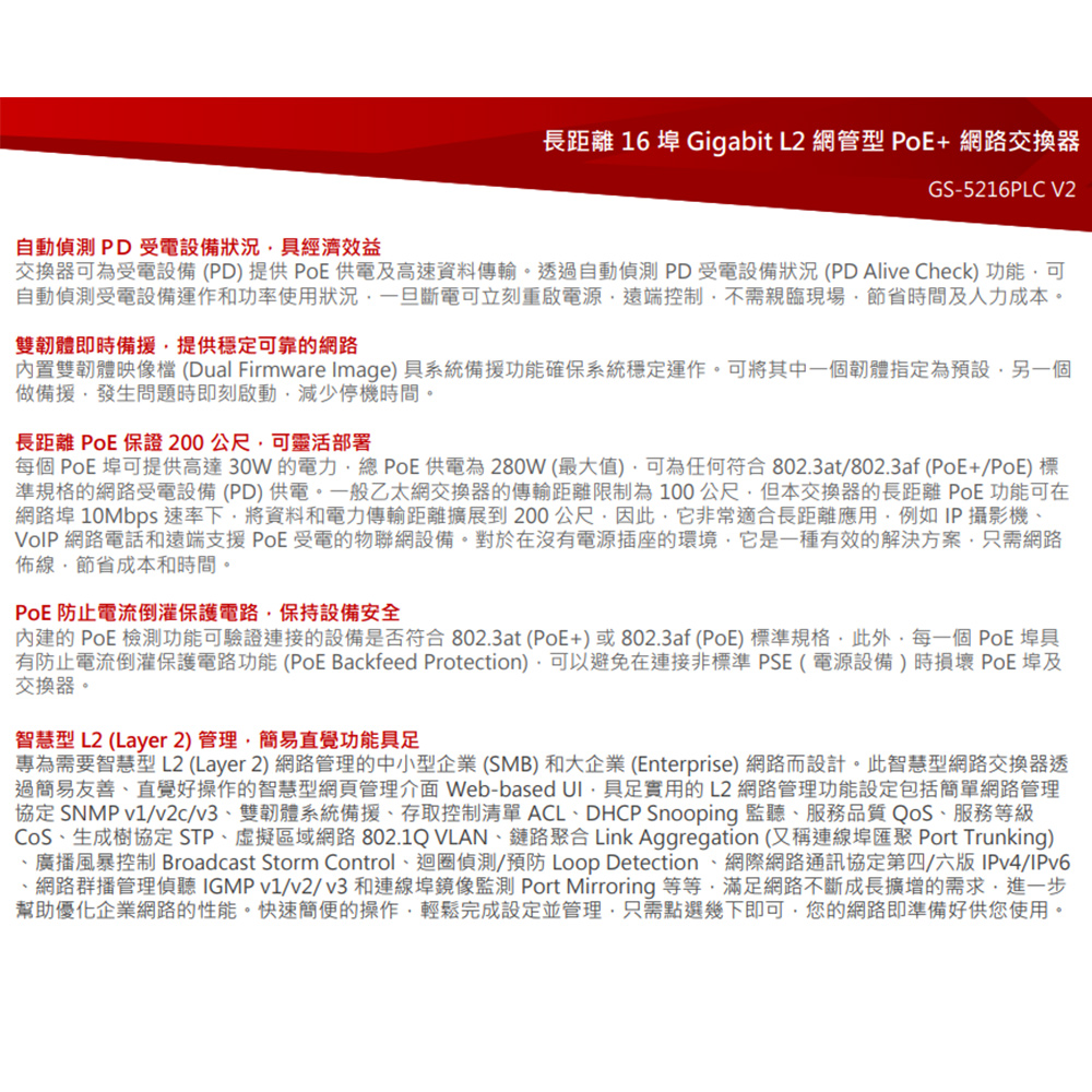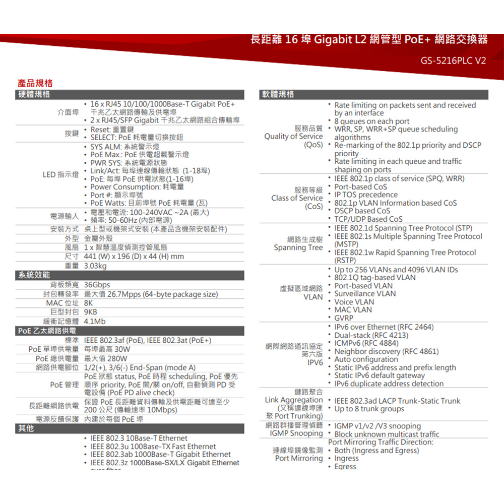 -智慧Layer 2網路管理支援SNMP v1/v2c/v3, Access Control List (ACL), QoS,802.1Q VLAN, IPv4/IPv6, Port Trunking, Port Mirroring, IGMP v1/v2/v3 Snooping等等。