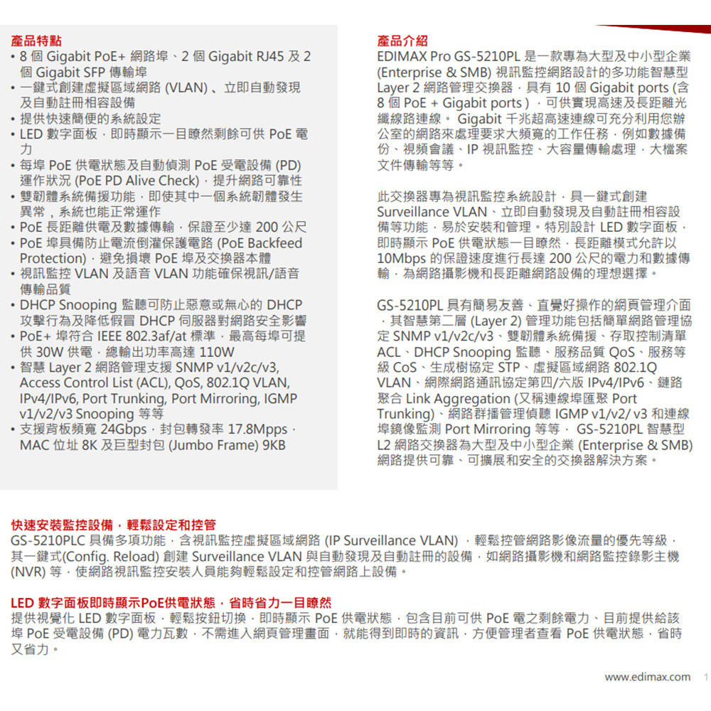 -8個Gigabit PoE+網路埠、2個Gigabit RJ45及2個Gigabit SFP傳輸埠。