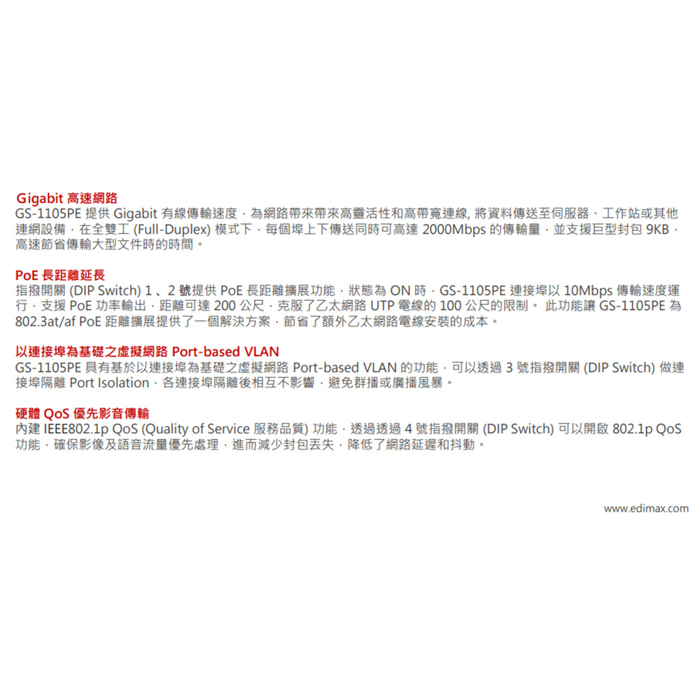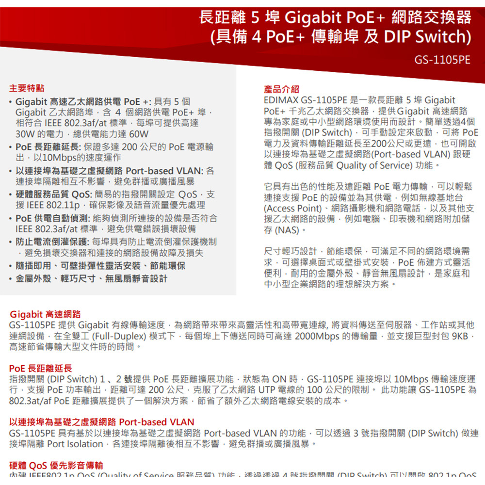 昌運監視器 EDIMAX 訊舟 GS-1105PE 長距離 5埠 Gigabit PoE+網路交換器