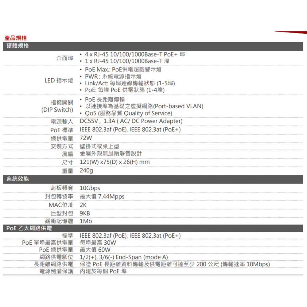-Gigabit高速乙太網路供電PoE + : 配備5個千兆埠,其中包括4個PoE+埠,符合IEEE 802.3af/at PoE標準,每個PoE埠支持最高30W(總功率預算:60W)。