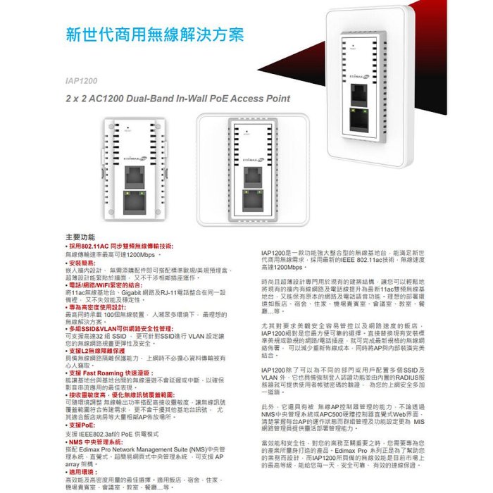 • 採用802.11AC 同步雙頻無線傳輸技術:無線傳輸速率最高可達1200Mbps 。• 安裝簡易:嵌入牆內設計, 無需添購配件即可搭配標準歐規/美規預埋盒,超薄設計能緊貼於牆面, 又不干涉相鄰插座運作。• 電話/網路/WiFi緊密的結合:將11ac無線基地台、Gigabit 網路及RJ-11電話整合在同一設備裡, 又不失效能及穩定性。• 專為高密度使用設計:最高同時承載 100個無線裝置, 人潮眾多環境下, 最理想的無線解決方案。• 多組SSID&VLAN可供網路安全性管理:可支援高達32 組 SSID , 更可針對SSID進行 VLAN 設定讓您的無線網路規畫更彈性及安全。• 支援L2無線隔離保護具備無線網路隔離保護能力, 上網時不必擔心資料傳輸被有心人竊取。• 支援 Fast Roaming 快速漫遊 :能讓基地台與基地台間的無線漫遊不會延遲或中斷,以確保影音串流應用的最佳表現。• 接收靈敏度高,優化無線訊號覆蓋範圍:可隨環境調整 無線輸出功率搭配高接收靈敏度,讓無線訊號覆蓋範圍符合佈建需求, 更不會干擾其他基地台訊號, 尤其適合飯店病房等大量相鄰AP佈放場所。• 支援PoE:支援 IEEE802.3af的 PoE 供電模式• NMS 中央管理系統:搭配 Edimax Pro Network Management Suite (NMS)中央管理系統,直覺式、超簡易網頁式中央管理系統 ,可支援 AParray 架構。• 適用環境 :高效能及高密度用量的最佳選擇。適用飯店,宿舍,住家,機場貴賓室,會議室,教室,餐廳…等。