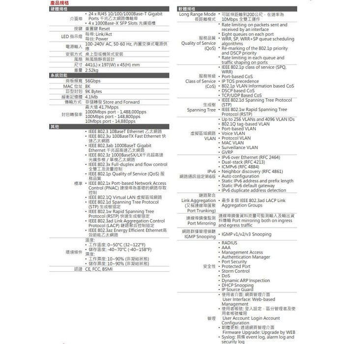 • 具備24個Gigabit網路埠及4個SFP光纖插槽。• 雙韌體功能可以減少交換器的停機時間。• VOICE VLAN 優化網路電話的通話品質。• DHCP SNOOPING 確保合法DHCP服務器運作正確性。• 網路線測試功能讓裝機人員輕易掌控網路線接線狀況和長度。• 長距離網路模式可延伸傳輸距離至200公尺。• 具備 56Gbps交換性能 , 8K MAC位址表 及 9KB jumbo frame。• 具備 HTTP/HTTPS , SSH/Telnet, SNMP等網管功能。• 無風扇和19 吋1U機架安裝設計。
