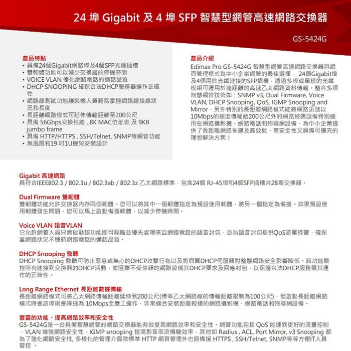 • 具備24個Gigabit網路埠及4個SFP光纖插槽。• 雙韌體功能可以減少交換器的停機時間。• VOICE VLAN 優化網路電話的通話品質。• DHCP SNOOPING 確保合法DHCP服務器運作正確性。• 網路線測試功能讓裝機人員輕易掌控網路線接線狀況和長度。• 長距離網路模式可延伸傳輸距離至200公尺。• 具備 56Gbps交換性能 , 8K MAC位址表 及 9KB jumbo frame。• 具備 HTTP/HTTPS , SSH/Telnet, SNMP等網管功能。• 無風扇和19 吋1U機架安裝設計。