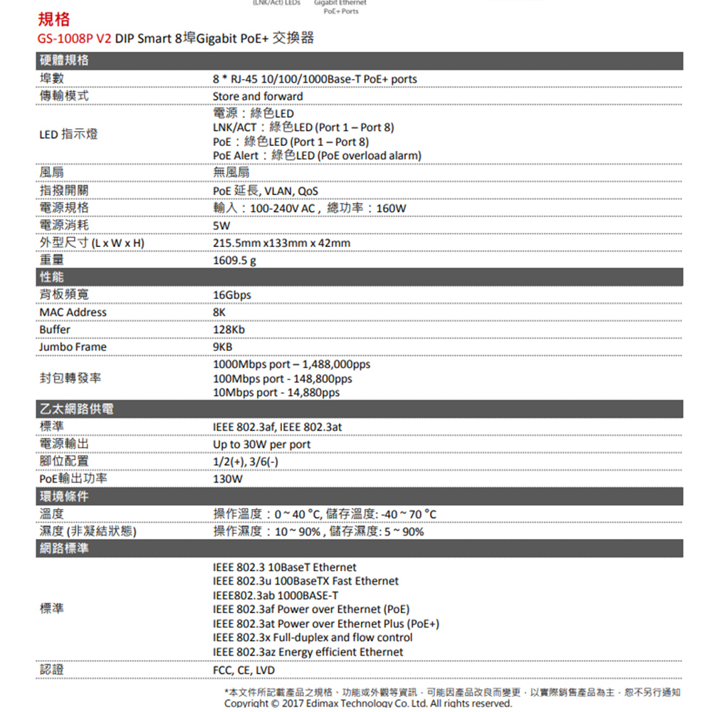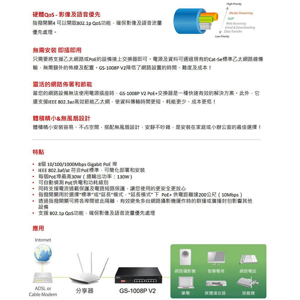 昌運監視器 EDIMAX 訊舟 PRO GS-1008P V2 超高速 8埠 Gigabit PoE+乙太網路交換器