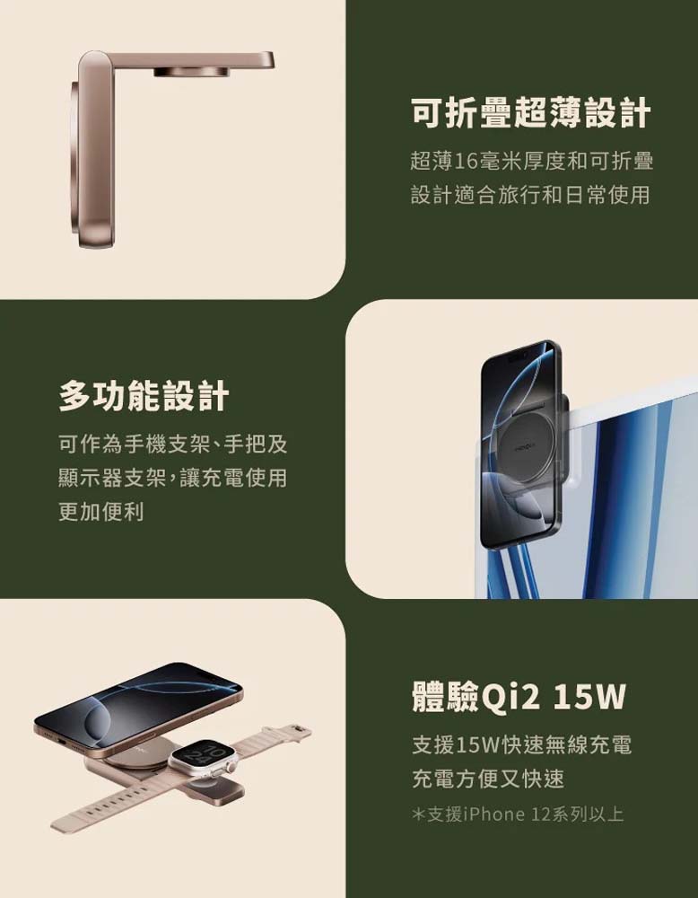 【商品特色】・Qi2 15W快充|iPhone 12↑全系列磁吸快充・ 超薄可折疊|僅16mm厚度,旅行收納超方便・ 三合一功能|手機支架、手把及顯示器支架・雙設備充電|同時充手機+Apple Watch【商品規格】▸ 輸入:9V/2.77A Max▸ 輸出:– 手機:5W/7.5W/10W/15W– 手錶:2.5W▸ 尺寸:65×73×16mm|重量:90g▸ 配件:充電座、1m USB-C線、保固卡、說明書