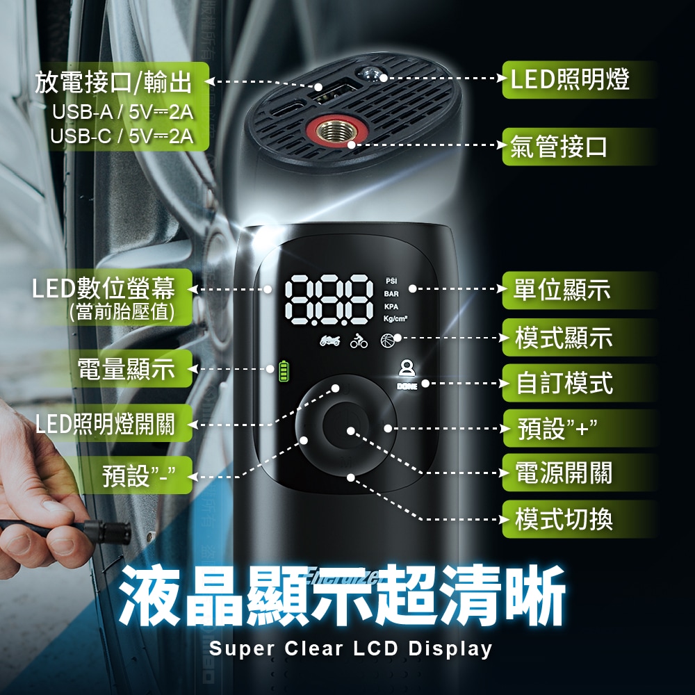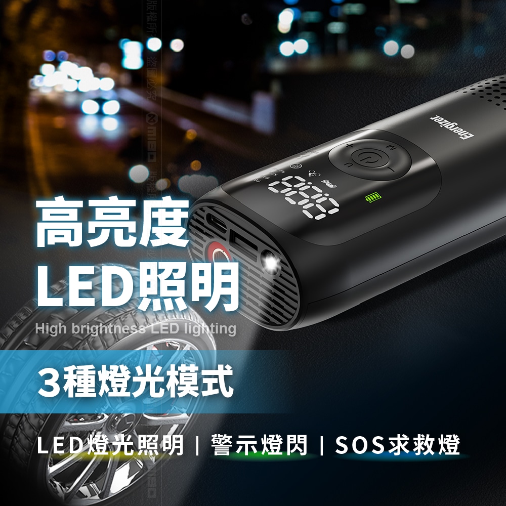 👍三種LED照明模式,白光照明/白光慢閃/白光爆閃,夜間打氣或是遇到緊急情況都好用。