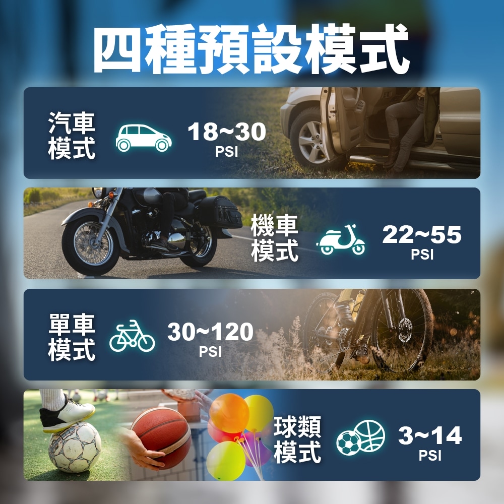 👍五種打氣模式,汽車、機車、自行車、球類(小體積充氣器材)及任意模式均可使用,附有法式氣嘴、球針、泳圈氣嘴、氣球氣嘴。