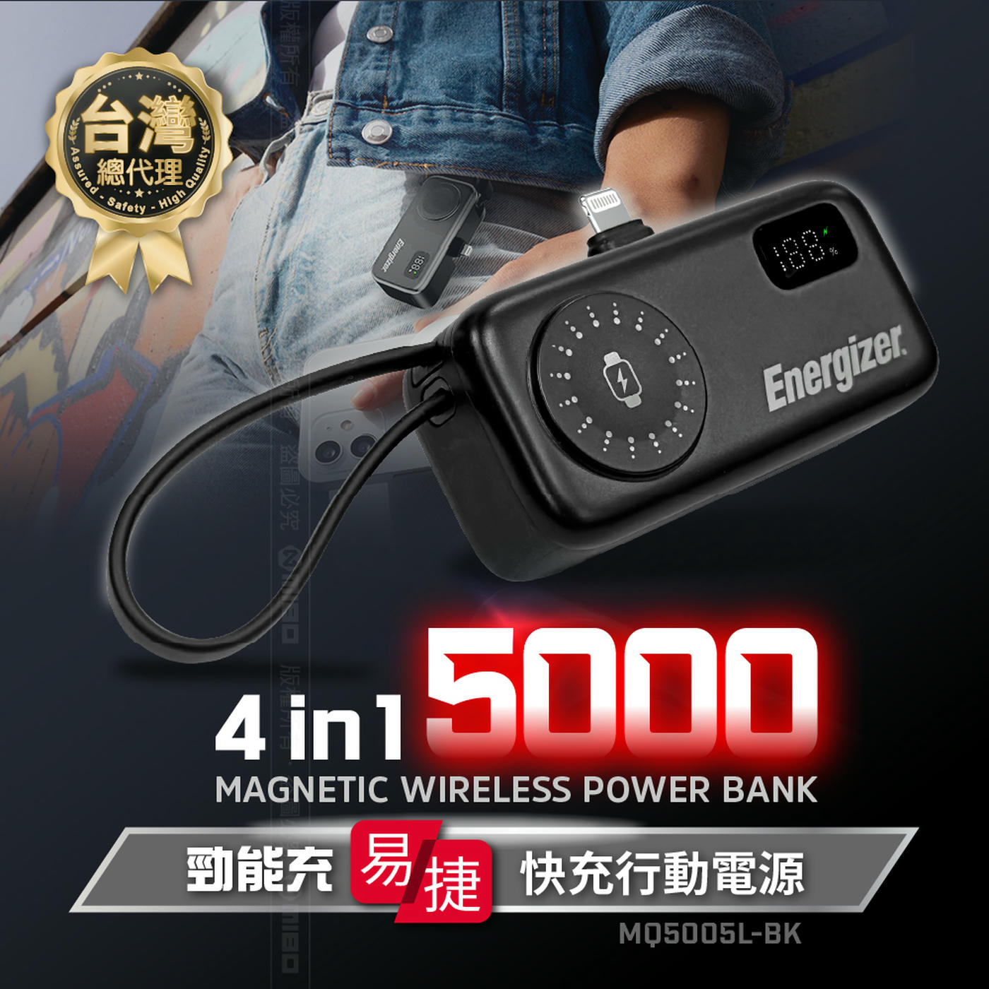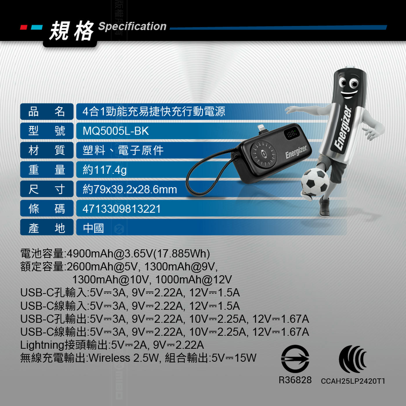 Energizer 勁量 易捷 MQ5005L 4合1 快充 行動電源 4900mAh 17.8Wh 黑色