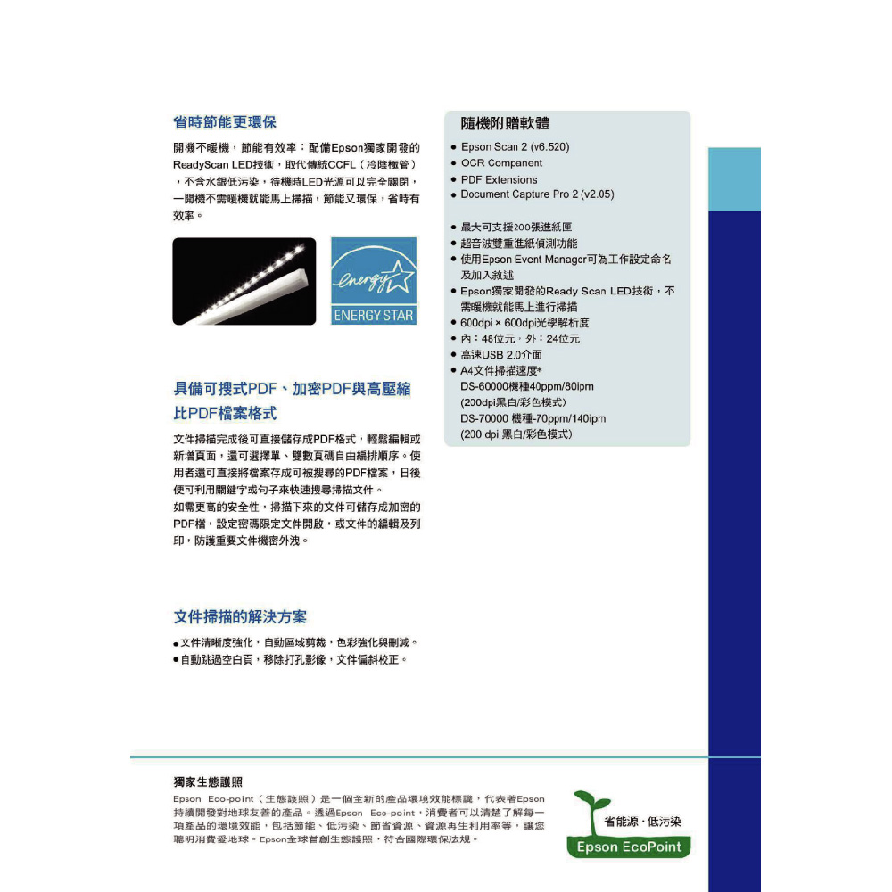 配備Epson獨家開發的ReadyScan LED技術,取代傳統CCFL(冷陰極管),不含水銀低污染,待機時LED 光源可以完全關閉,一開機不需暖機就能馬上掃描,節能又環保,省時有效率。