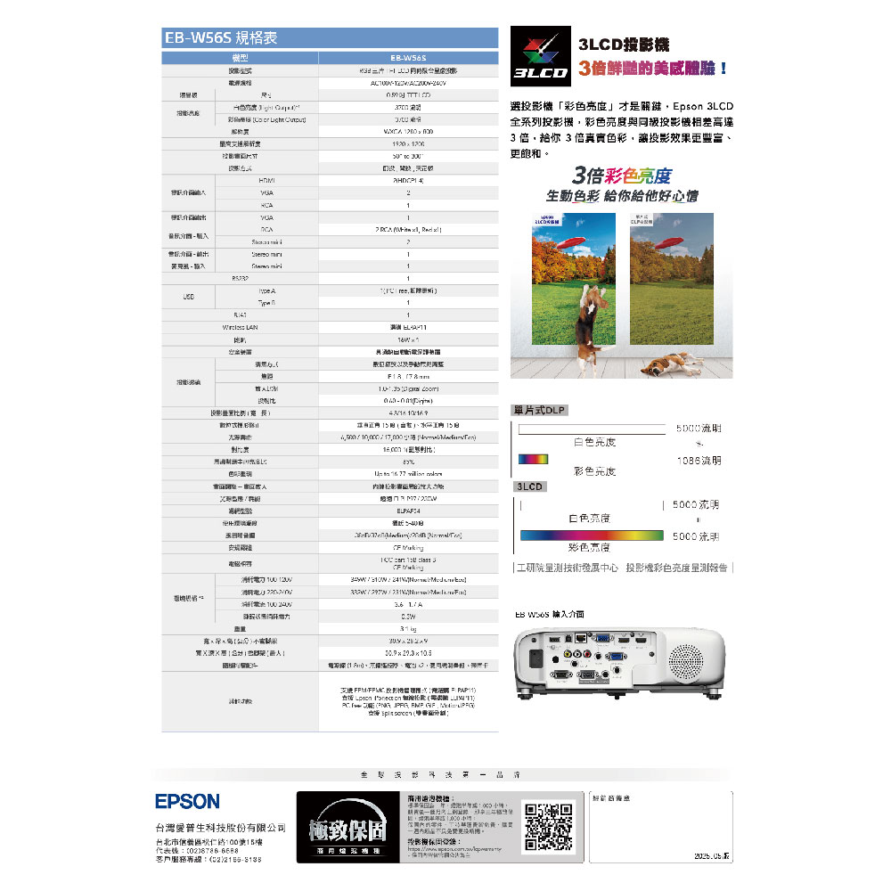 昌運監視器 EPSON 愛普生 EB-W56S 商務與教學的短距投影機 WXGA 解析度