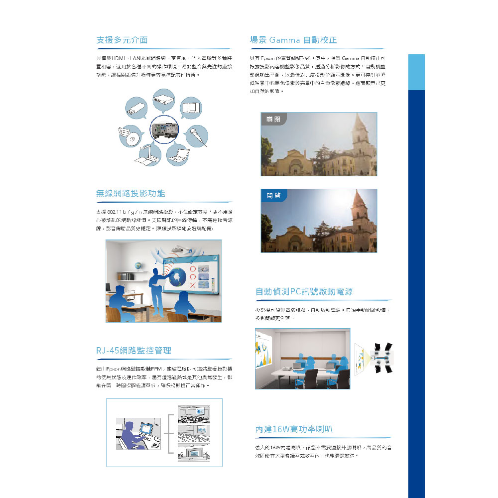 最高17000小時智慧長效燈泡,每小時使用成本更低。全新的智慧偵測功能會因應環境光源與影像內容,自動調整投影亮度,節省電力更提供您更優質的會議與教學投影品質