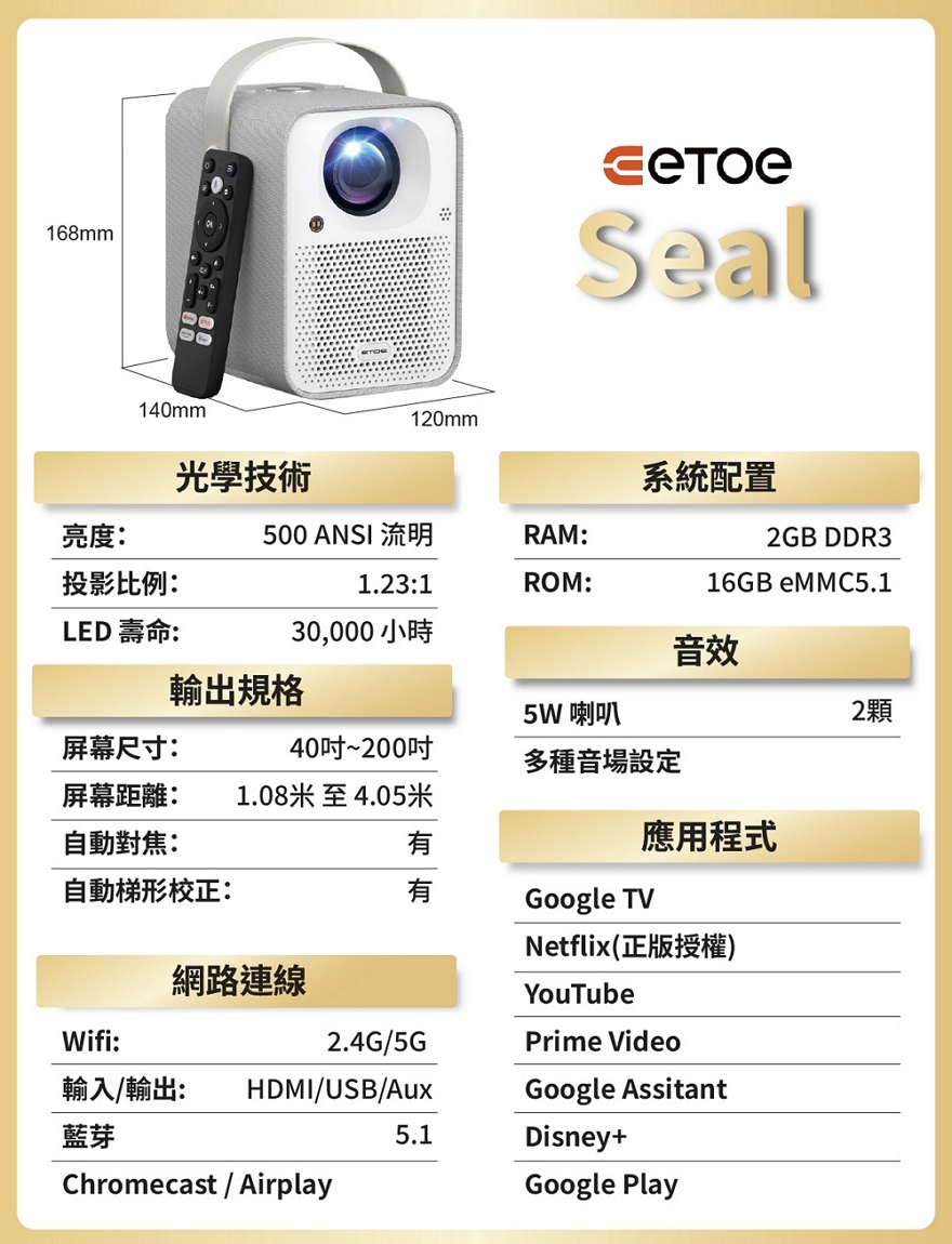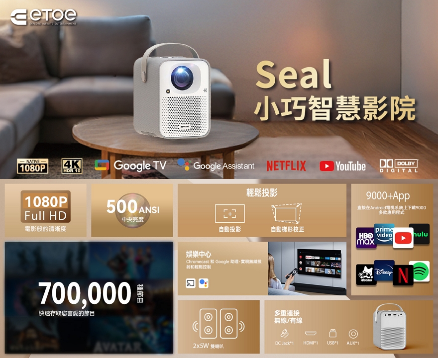 【ETOE 翼拓】Seal AI 智慧投影機 珍珠白 (正版GoogleTV授權)+贈送ETOE桌上型腳架