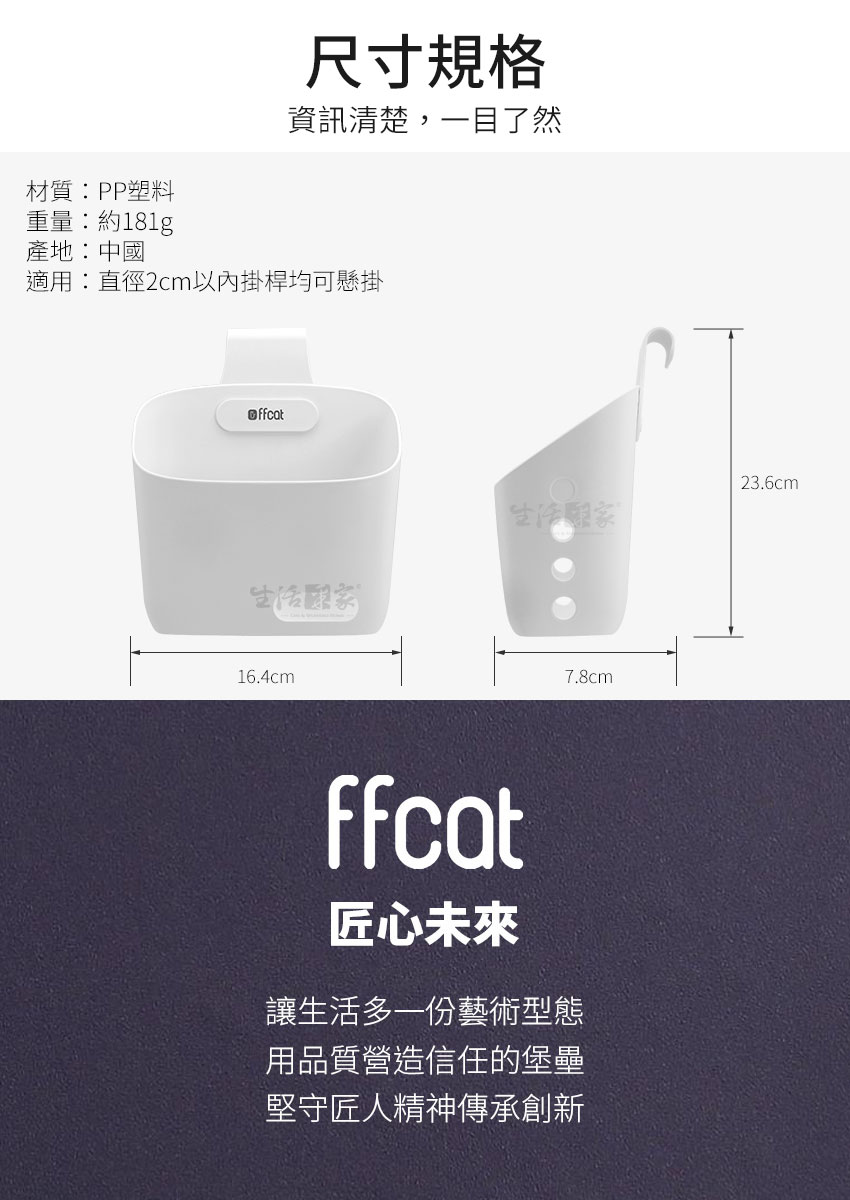 商品規格:1.尺寸:約寬16.4*深7.8*高23.6cm(含掛勾)2.材質:PP塑料3.重量:約181g4.顏色:白色、灰色(隨機出貨)5.產地:中國6.適用:直徑2cm以內掛桿均可懸掛