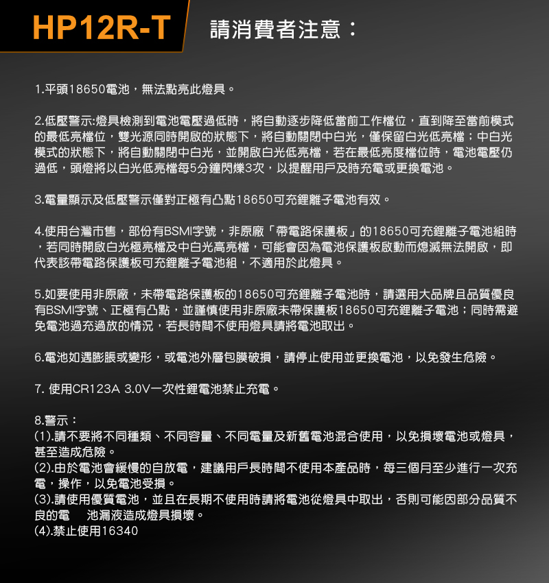 5.如要使用非原廠,未帶電路保護板的18650可充鋰離子電池時,請選用大品牌且品質優良有BSMI字號、正極有凸點,並謹慎使用非原廠未帶保護板18650可充鋰離子電池;同時需避免電池過充過放的情況,若長時間不使用燈具請將電池取出。