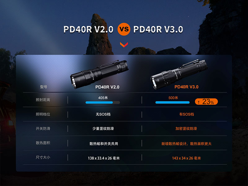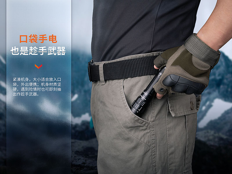 ※本產品說明,僅供參考,請勿作為正式採購招標規格,如有需要,請來電本公司洽詢相關業務人員。 (以下為原廠提供參考數據,非絕對) 品名:FENIX PD40R V3.0超高亮機械旋轉調光手電筒 型號:#PD40R V3.0 ◎最高亮度3000流明,最遠射程500米 ◎使用1顆高性能LED,壽命50000小時 ◎標配1節ARB-L21-5000 V2.0電池 ◎專利頸部機械旋轉調光技術,檔位精准,可單手操作,不易誤觸 ◎Type-C充電介面,充電速度快,通用性強 ◎開機電量顯示和低壓警示功能 ◎尾部平整,可倒立使用 ◎配備抱夾,適應多種場景需求 ◎全金屬CNC加工機身 ◎表面進行了HAIII硬質陽極氧化抗磨處理 ◎尺寸(±10%):143x 34x 26毫米 ◎重量(±10%):198克(含電池)