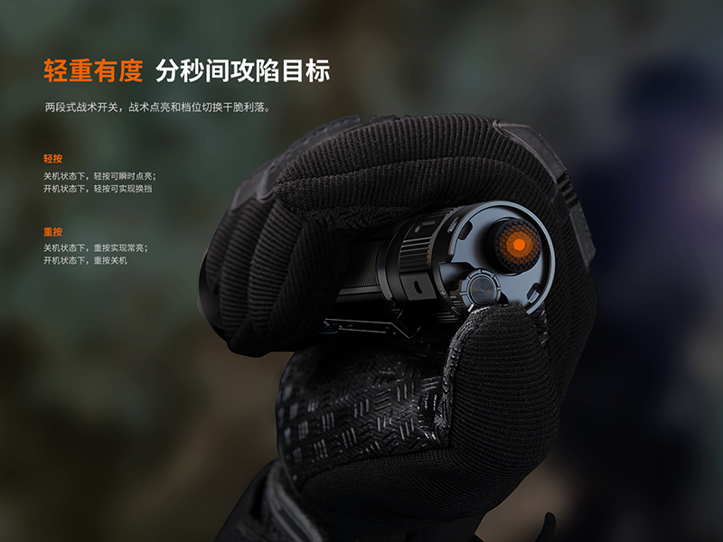 ◎最高亮度3200流明,最遠射程480米。◎使用1顆Luminus SST70,壽命50000小時。◎標配1節ARB-L21-5000 V2.0電池。◎專利的“FlexiSensa Control”多功能“靈感撥盤”,可精准切換不同模式,高效便捷。◎隱藏式Type-C充電介面,充電速度快,通用性強。◎戰術勤務雙模式,滿足不同場景使用需求。◎兩段式戰術開關,可快速實現戰術點亮和換擋功能。◎開關鎖鍵功能,可有效防止誤觸點亮,攜帶更安心。◎防反接設計,防止電池裝反對電路造成危害。◎不銹鋼鍍鈦攻擊頭及破窗鎢鋼尖設計,應急防身,保障安全。◎使用雙面增透膜鋼化玻璃鏡片。◎採用A6061-T6鋁材製造 。◎表面進行了軍規三級硬質陽極氧化的抗磨處理。◎尺寸(±10%): 158(筒長)X 40(筒頭直徑)X 25.4(筒身直徑)毫米◎重量(±10%):218克(含電池)