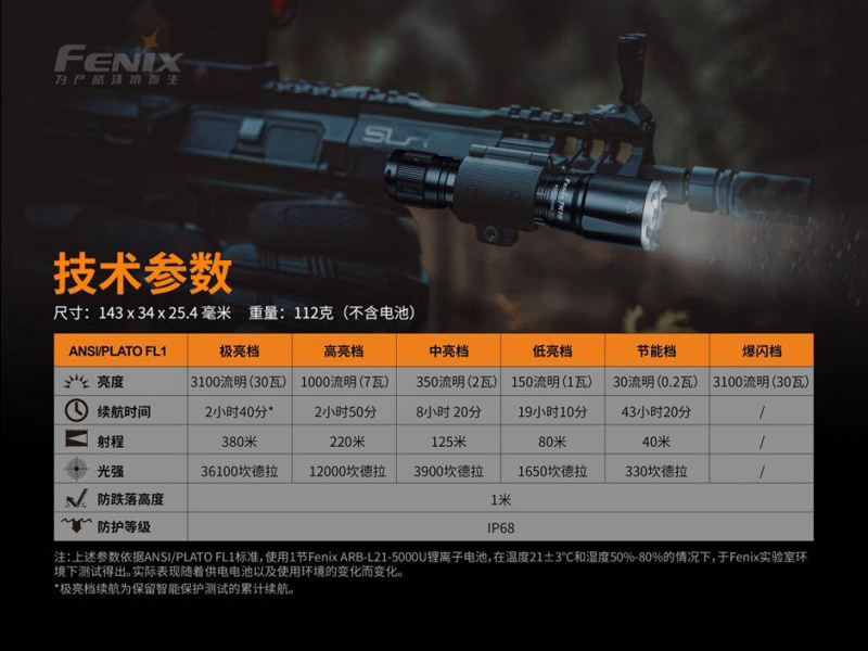 ◎最高亮度3100流明,最遠射程380米◎使用1顆Luminus SST70,壽命50000小時◎標配1節Fenix ARB-L21-5000U 鋰離子電池◎採用APF先進脈衝頻率傳輸系統,盡顯戰術優勢◎戰術雙尾按控制,快速實現一觸即亮、一鍵爆閃◎使用不銹鋼攻擊頭鑲嵌鎢鋼珠◎採用雙面增透膜鋼化玻璃鏡片,透光性強◎採用A6061-T6鋁合金材質製造,表面進行了HAIII硬質陽極氧化抗磨處理◎尺寸(±10%):143(筒長)×34(筒頭直徑)×25.4(筒身直徑)毫米◎重量(±10%):112克(不含電池)
