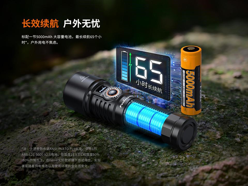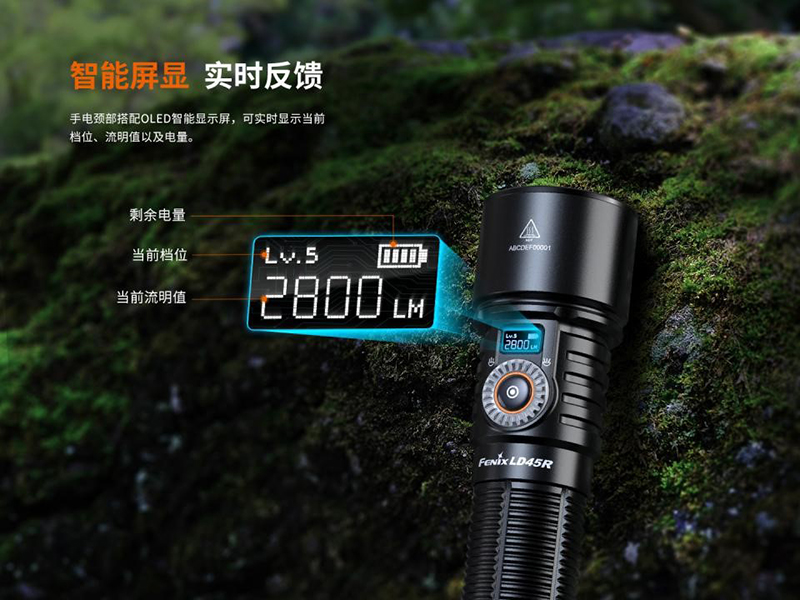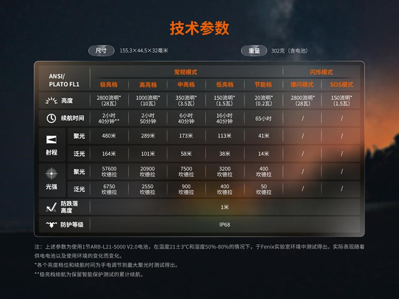 ◎最高亮度2800流明,最遠射程480米◎使用1顆Luminus SFT70 LED,壽命50000小時◎標配1節Fenix ARB-L21-5000 V2.0鋰離子電池◎採用電控調焦技術,順時針或逆時針撥動旋轉撥盤,單手操作,實現聚光和泛光的精准調節◎頸部調光按鍵,一鍵調光換擋◎變頻爆閃和SOS功能,更好保障戶外活動安全;◎採用OLED智慧顯示幕,可顯示當前檔位元,亮度,剩餘電量以及充電狀態◎手電筒頸部設有內防水設計的Type-C充電介面,便捷省心◎採用高強度A6061-T6耐氧化鋁材製造◎表面HAIII硬質陽極氧化抗磨處理,耐磨抗摔◎防反接設計,防止電池裝反對電路造成危害◎尺寸(±10%):155.3(筒長)×44.5(筒頭直徑)×32(筒身直徑)毫米◎重量(±10%):302克(含電池)
