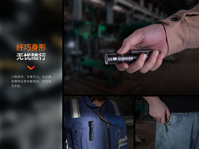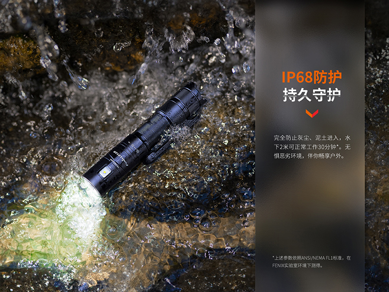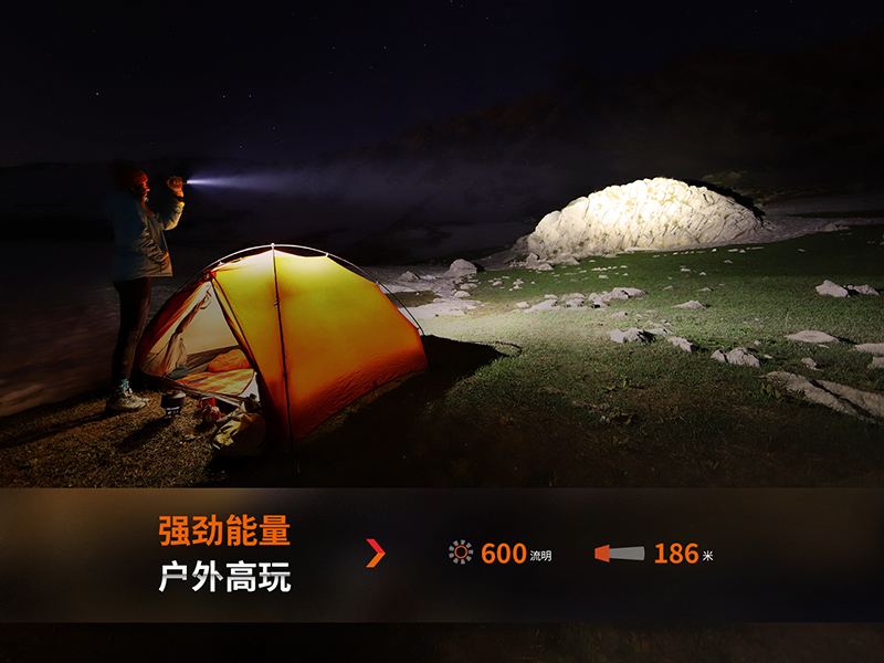 ◎最高亮度600流明,最遠射程186米;◎使用高性能白光LED,壽命50000小時;◎360°旋轉調光雙光源設計,聚泛結合,旋轉快速切換模式;◎標配1節ARB-L14-800電池,相容一節AA鹼性電池或鎳氫電池;◎隱藏式Type-C充電口,外觀更整體;◎電量指示和低壓警示功能;◎配備磁吸抱夾,解放雙手,操作更自由;◎適配Fenix AOD-S V2.0柔光罩,滿足多種使用需求;◎智慧溫控,防止外殼溫度過高影響使用舒適度;◎全金屬CNC加工機身;◎表面進行了HAIII硬質陽極氧化抗磨處理;◎IP68級防護;◎尺寸(±10%):121(筒長) × 22(筒頭直徑) × 19(筒身直徑) 毫米◎重量(±10%):74克(含電池)