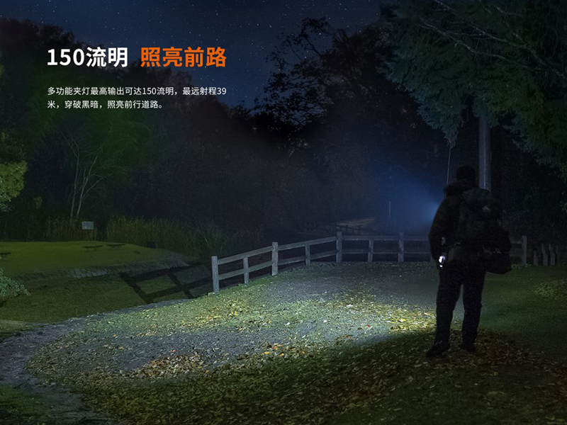 ◎最高亮度達150流明,最遠射程39米。◎採用1顆高性能白光LED和1顆365nm UV LED,壽命50000小時。◎白光/UV光雙光源設計,一燈多用途。◎採用365nm紫外光光源。◎內置700mAh鋰聚合物電池,便捷更省心。◎採用內防水設計的Type-C充電介面,即插即充。◎可向前105°、向後95°旋轉調節燈頭,滿足多角度照明需求。◎一體厚、薄雙夾設計,更好的相容口袋、帽檐等不同厚度夾持。◎尾部磁吸功能,可吸附鐵質表面,有效解放雙手。◎正面白光開關以及側面UV光開關,實現開關,換檔,以及模式切換操作。◎尺寸(±10%):81.2(長)x35(寬)x18(高)毫米。◎重量(±10%):55克(含電池)。