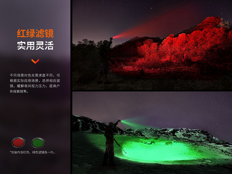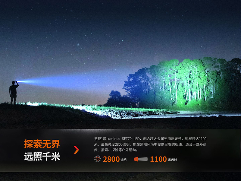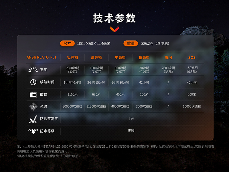 ◎最高亮度2800流明,最遠射程1100米◎使用1顆Luminus SFT70 LED,壽命50000小時◎使用1節21700可充電鋰離子電池供電◎機身帶USB Type-C充電介面,內防水結構◎配備紅光、綠光濾鏡各1片◎可單手操作尾部雙開關,一鍵爆閃◎具有開機電量指示和低壓示警功能◎採用T6061-T6鋁材製造,表面進行了HAIII硬質陽極氧化抗磨處理◎尺寸(±10%):188.5(筒長)×68(筒頭)×25.4(筒身)毫米◎重量(±10%):252.7克(不含電池)
