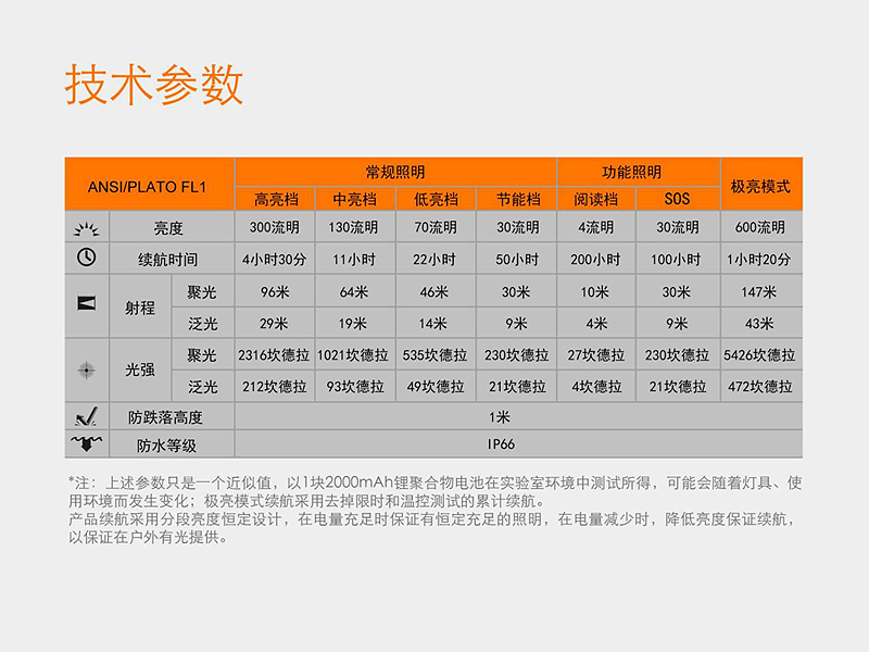 ◎ Cree XP-L HI V2,白光LED,壽命50000小時◎ 內置2000mAh鋰聚合物電池◎ 68毫米(長)×54毫米(寬)×42毫米(高)◎ 淨重130克 (包含頭燈帶)◎ 雙開關控制,操作方便快捷◎ Micro USB介面, 5V/1A充電◎ 4個電量指示燈,檢測剩餘電量◎ 按鍵鎖定功能◎ 極亮檔溫控降亮度保護◎ 降壓恒流電路,亮度恒定◎ 採用優質塑膠及鋁合金製造