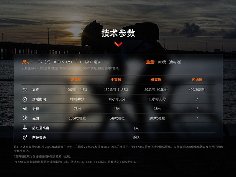 ◎最高亮度400流明,最遠射程78米◎內置2600mAh鋰離子電池,續航時間長◎採用USB Type-C介面充電◎單按鍵開關,操作簡單快捷◎具有電量指示和低電警示功能◎截止線光斑,防炫目,帶左右側向燈,城市騎行更安全◎可裝在GoPro介面碼表支架和頭盔支架上,使用更方便(配件需另外購買)◎IP66防護等級◎尺寸(±10%):102(長) × 31.5(寬) × 31(高) 毫米◎重量(±10%):109克(含電池)