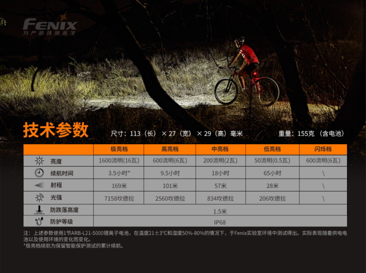 (以下為原廠提供參考數據,非絕對)品名:FENIX BC26R 超亮可充式山地車燈型號:#BC26R