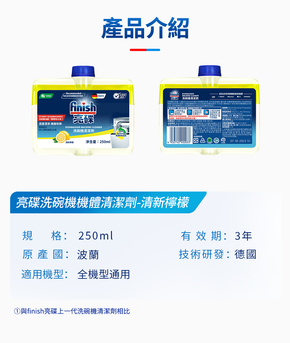 [finish 亮碟] 洗碗機機體清潔劑檸檬250ml(每月一次/瓦解機體細縫油漬/去除水垢異味/深度清潔洗碗機)8入組