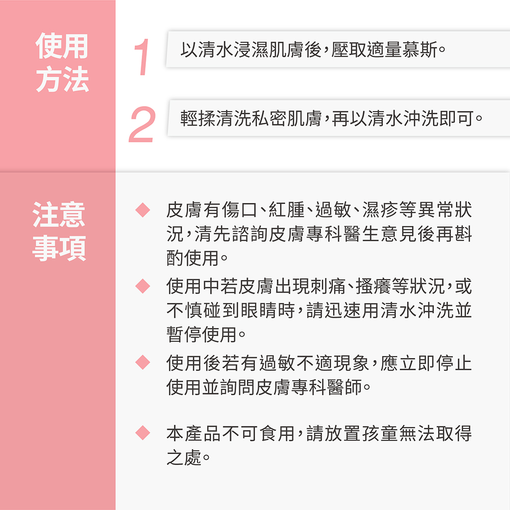 以清水將肌膚浸溼後,壓取適量胺基酸私密柔護慕斯,輕柔清洗私密肌膚,再以清水沖淨即可。