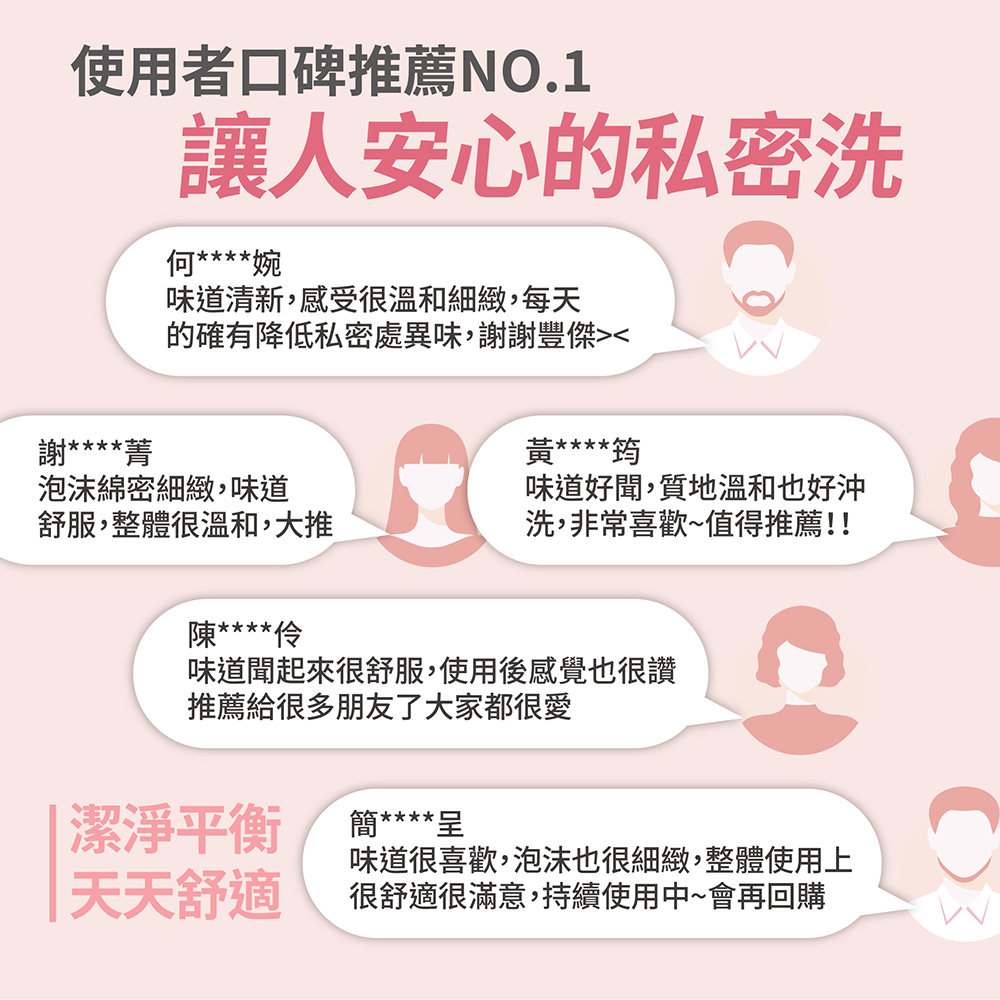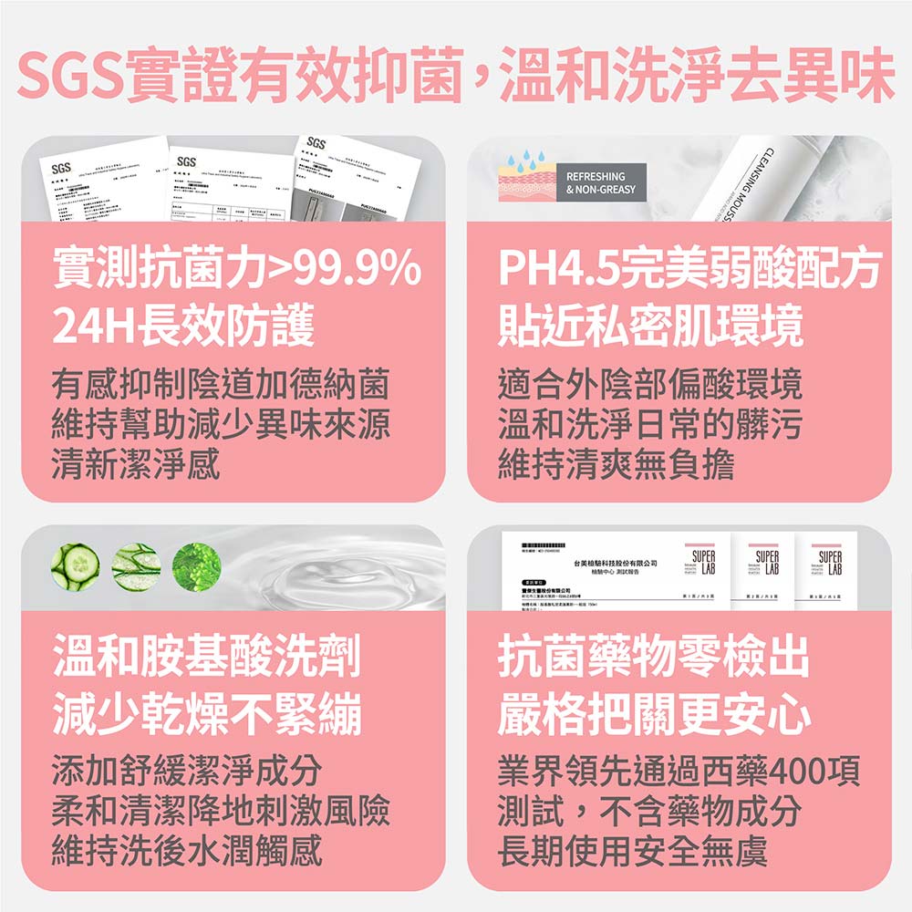 使用胺基酸私密柔護慕斯 可以幫助溫和去除私密肌膚的髒污、汗水、調理肌膚,進而幫助肌膚更加光滑柔嫩,pH5.5洗後保濕溫和舒適是您很好的選擇!