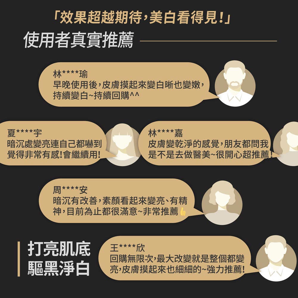產品功效:全效美白、打擊暗沉斑點產品特色:添加三大法定美白成分,有效打擊肌膚暗沉、斑點,改善蠟黃等肌膚問題,並添加小分子胜肽、植萃活性等舒緩彈嫩配方,驅黑淨白展現亮麗美肌。