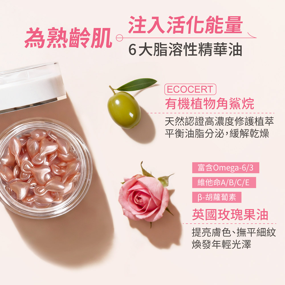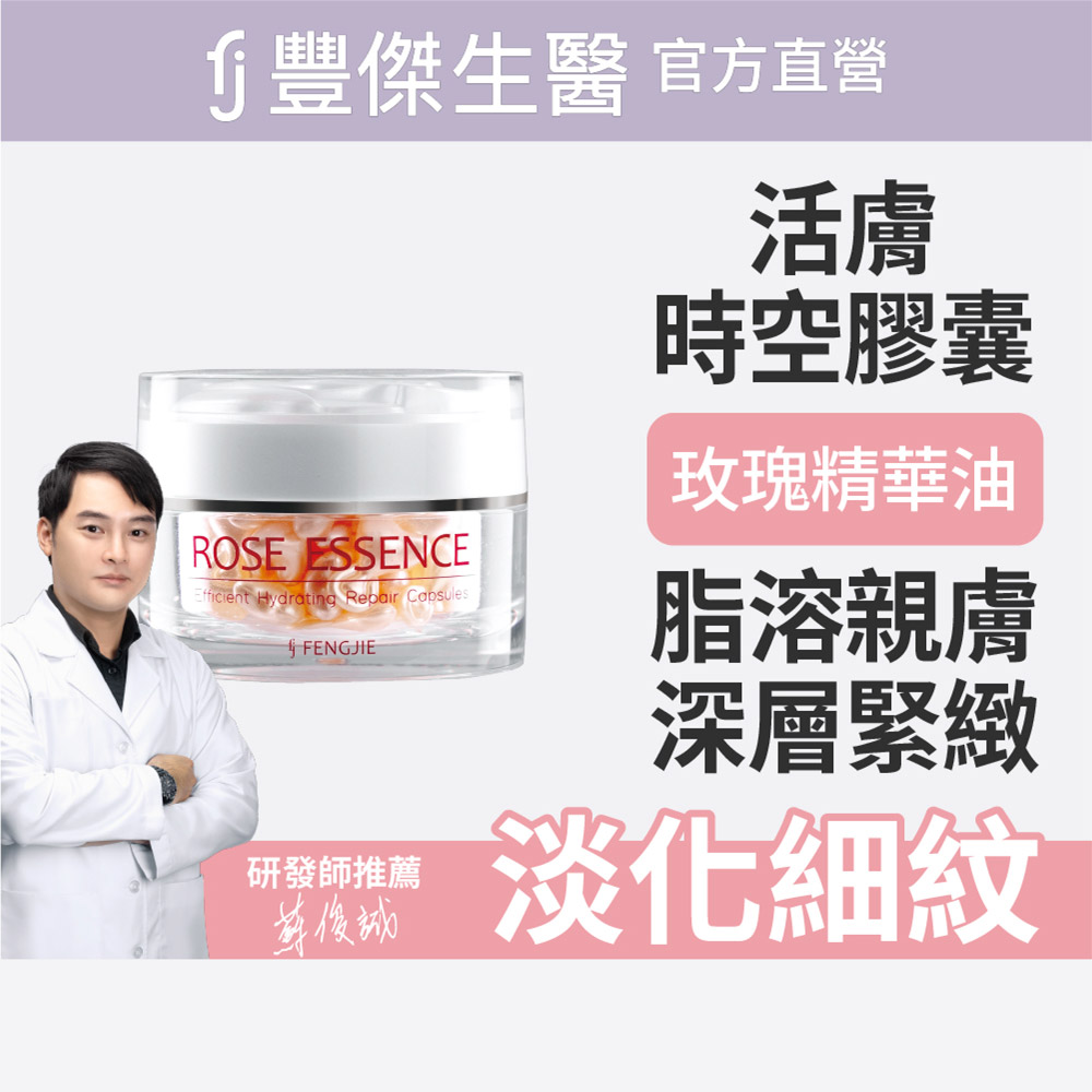 Q1.什麼樣的肌膚不適用呢?本產品適用於所有膚質,但有開放性傷口的肌膚不建議,請好好讓傷口復原後再使用喔!Q2.孕婦與男性也適用嗎?當然適用!孕婦可安心使用,且豐傑的產品主要以全膚質適用研發生產,不論男女皆可使用喔。Q3.可以搭配粉底液使用嗎?可以喔,化妝時將玫瑰活膚膠囊轉開,加入1~2滴至粉底液當中,稍微混合之後,上妝可增加妝感服貼度,打造光澤感肌膚。Q4.有敏感情形但真的很想使用怎麼辦?建議您可先聽從醫師建議,確認敏感源後再做使用。Q5.修修臉之後可以使用嗎?可以的,修修臉後反而更需要注重臉部保濕,若您有進行開放性肌膚療程,還是建議先諮詢過醫師。Q6.玫瑰瞬效活膚膠囊包含哪些主成分?包含六大美膚精粹:黃金海藻、英國玫瑰果、摩洛哥堅果、酪梨果油、植物角鯊烷、維他命E,以及鎖水關鍵神經醯胺等,多方精華成分濃縮而成。Q7.想要讓緊緻嫩膚效果更好該怎麼做?想要讓緊緻嫩膚效果更好,化妝水、精華液不可少!好的化妝水可以幫助增加後續護膚品吸收率,精華液則是可以精準高效保濕撫紋。如果您容易乾燥且有細紋問題,推薦您搭配使用【玫瑰潤澤青春露】和【玫瑰賦活精華液】,潤澤淡紋效果更加乘呦!Q8.「逆齡霜」跟「玫瑰膠囊」,那個先用?先擦霜還是先擦油?保養過程建議先水後油;將玫瑰膠囊放在最後一道程序使用。例如:玫瑰青春露→極萃煥白雪肌露→富勒烯逆齡霜→玫瑰活膚膠囊,更能夠幫您加強潤澤鎖水的效果---------------------------------------------------------------------------【使用方式】適合臉部清潔後或精華液後使用。輕輕扭開膠囊將精華擠於掌心,由較乾、暗沉部位開始向外按摩推勻。【產品功效】保濕.緊緻.嫩白,1顆極致滋養、重返青春對抗肌膚老化、快速滲透,延緩老化滋養皮膚、輕柔按壓,釋放最新鮮的逆齡能量 【商品特色】✔輕柔按壓,釋放最新鮮的逆齡能量 ✔六大美膚精粹,脂溶性更有效穿透 ✔法國深海巨藻,啟動青春能量 ✔王妃最愛逆齡秘密,活化緊緻肌膚 ✔快速滲透滋養、延緩老化改善皮膚彈性 ✔重返青春對抗肌膚老化,強化屏障功能 【主要成分】 CyclopentasiloxaneㆍDimethiconol、Isotridecyl IsononanoateㆍSqualane ㆍ Helianthus Annuus (Sunflower) Seed Oil Unsa-ponifables ㆍ RoseHip Seed Oil 、 Caprylic/Capric Triglyceride Simmondsia Chinensis (Jojoba) Seed Oil 、Tocopheryl Ace-tate ㆍ Persea Gratissima (Avocado) Oil ㆍ Pelargonium Grave-olens Flower Oil ㆍCupressus Funebris Wood Oil ㆍ Bisabolol 、Argania Spinosa Kernel Oil、Beheny AlcoolLaminaria Ochroleuca Extract ㆍ Polyglyceryl-10 Pentastearateㆍ Sodium Stearoy| Lactylate、Phytosteryl Isostearate、Ceramide 3 Ceramide 6 || Ceramide 2.【商品規格】容量規格: 3顆/袋保存期限: 3年貨源: 公司貨產地: MIT劑型:液劑【注意事項】皮膚有傷口、紅腫、過敏、濕疹等異常狀,請先詢皮膚專科醫生意見後再斟酌使用。使用中若肌膚出現刺痛、搔療狀況,或不慎碰到眼睛時,請迅速用清水清洗。使用後若有過敏不適現象,應立即停止使用並詢問皮膚專科醫師。本產品不可食用,請放置孩童無法取得之處。